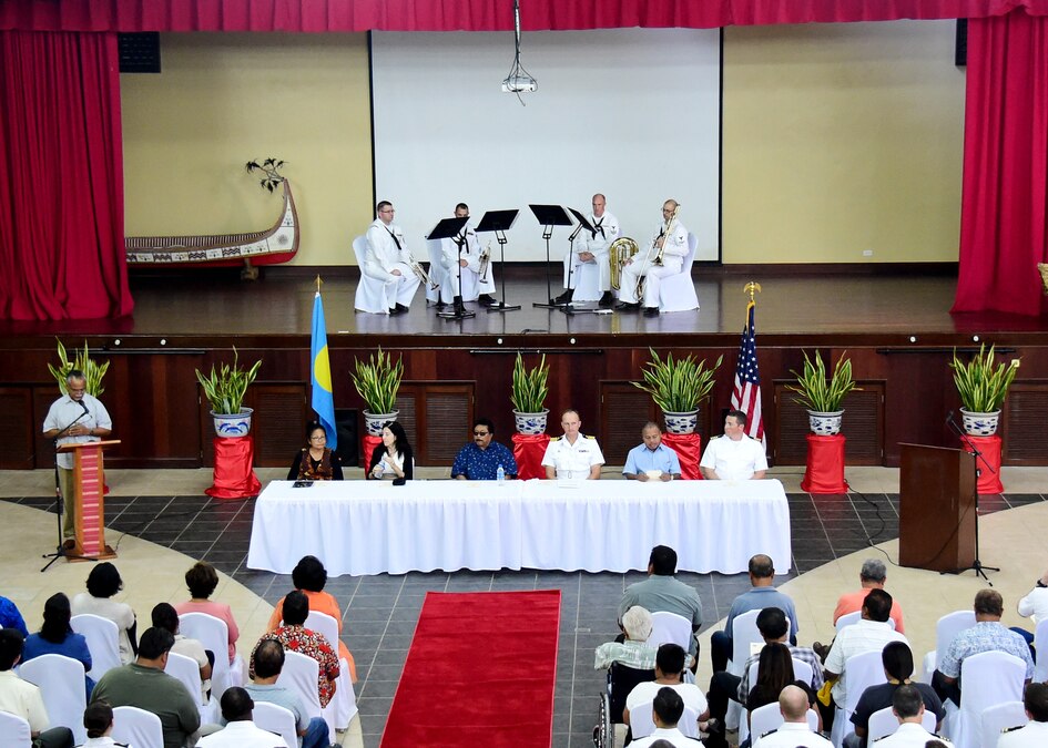 180404-N-QV906-033 KOROR, Republic of Palau (April 4, 2018) Distinguished guests are seated at the head table during the opening ceremony of Pacific Partnership (PP) 2018's mission stop to Palau. The distinguished attendees included the Honorable Raynold B. Oilouch, vice president of Palau, the Honorable Faustina Rehuher Marugg, minister of state of Palau, Paramount Chief Ibedul Yataka M. Gibbons, the Honorable Amy Hyatt, U.S. ambassador to Palau, Capt. Peter Olive, deputy mission commmander of PP-18, and Capt. Charles Black, commanding officer of the expeditionary fast transport ship USNS Brunswick (T-EPF 6). PP-18's mission is to work collectively with host and partner nations to enhance regional interoperability and disaster response capabilities, increase stability and security in the region and foster new and enduring friendships across the Indo-Pacific region. (U.S. Navy photo by Mass Communication Specialist 1st Class Micah Blechner/Released)