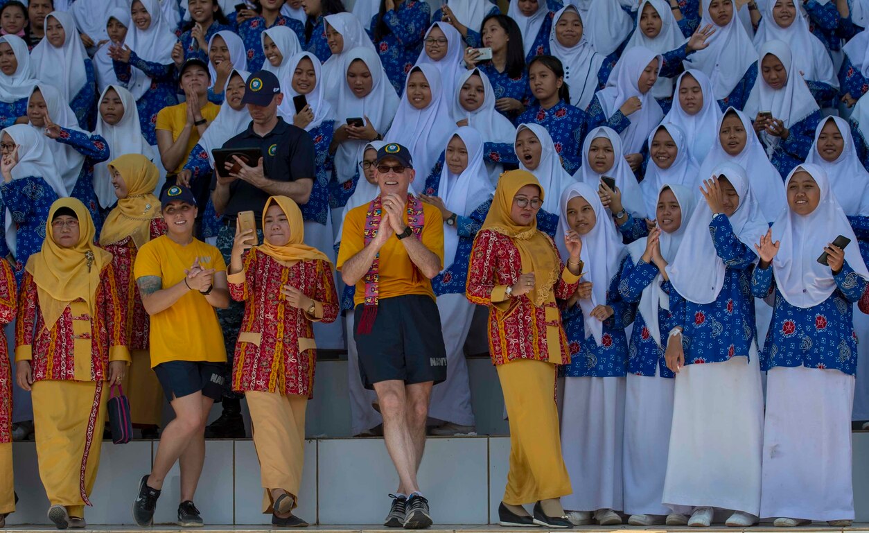 180405-N-NH199-0085 BENGKULU, INDONESIA (April 5, 2018) Joint Service members assigned to the U.S. Navy hospital ship USNS Mercy (T-AH 19) dance with SMP Negeri 5 High School students during a community relations cultural exchange and band performance. Mercy is deployed in support of Pacific Partnership (PP) 2018, whose mission is to work collectively with host and partner nations to enhance regional interoperability and disaster response capabilities, increase stability and security in the region and foster new and enduring friendships across the Indo-Pacific region. (U.S. Navy photo by Mass Communication Specialist Seaman Harley K. Sarmiento/Released)