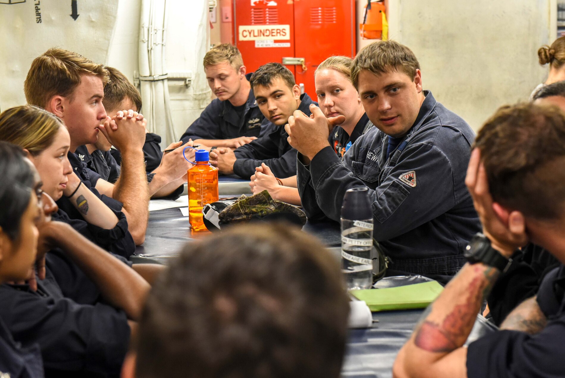 180409-N-ET513-0018 U.S. 5TH FLEET AREA OF OPERATIONS (April 9, 2018) Sailors hold a Junior Enlisted Association meeting in the mess decks abord the Arleigh Burke-class guided-missile destroyer USS Laboon (DDG 58). Laboon, homeported at Naval Station Norfolk, is in the U.S. 5th Fleet area of operations in support of maritime security operations to reassure allies and partners and preserve the freedom of navigation and the free flow of commerce in the region. (U.S. Navy photo by Mass Communication Specialist 3rd Class Kallysta Castillo/Released)