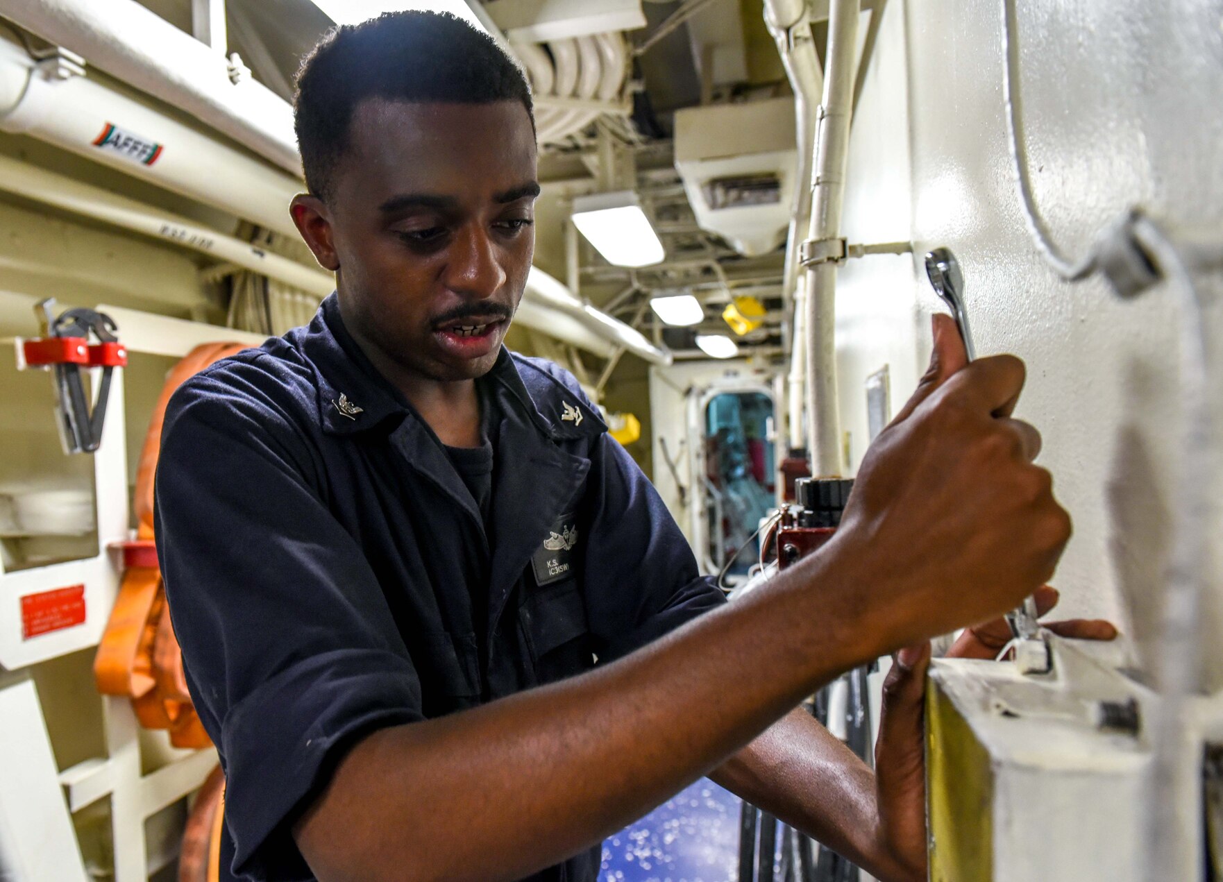 180410-N-ET513-0027 U.S. 5TH FLEET AREA OF OPERATIONS (April 10, 2018) Interior Communications Electrician 3rd Class Kyrick Lee repairs a cypher lock aboard the Arleigh Burke-class guided-missile destroyer USS Laboon (DDG 58). Laboon, home-ported in Naval Station Norfolk, is in the U.S. 5th Fleet area of operations in support of maritime security operations to reassure allies and partners and preserve the freedom of navigation and the free flow of commerce in the region. (U.S. Navy photo by Mass Communication Specialist 3rd Class Kallysta Castillo/Released)