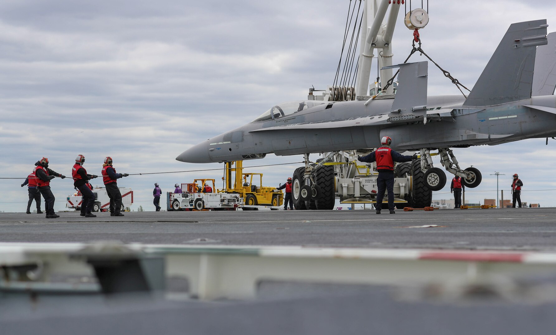 180417-N-NN369-1193 NORFOLK (April 17, 2018) Sailors assigned to the crash and salvage team maneuver a training aircraft during an Air Department Training Team drill for Command Assessment of Readiness and Training II on the flight deck of the Nimitz-class aircraft carrier USS Abraham Lincoln (CVN 72). (U.S. Navy photo by Mass Communication Specialist 2nd Class Jessica Paulauskas/Released)