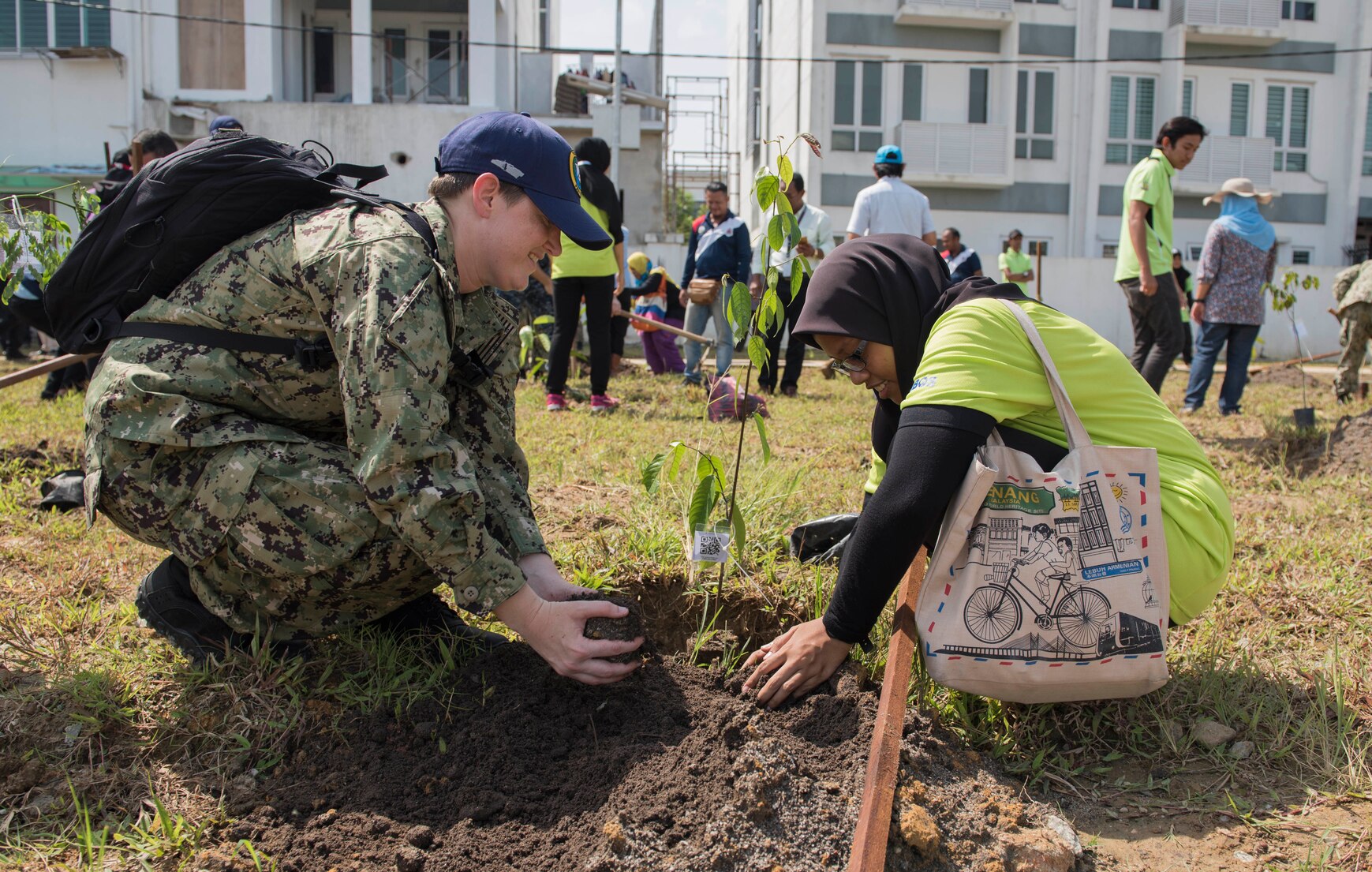 180418-N-OU129-128 KUALA LUMPUR, Malaysia (April 18, 2018) Information Systems Technician 1st Class Karena Bricker plants a tree with a local student during a river restoration project near Kuala Lumpur, Malaysia, as a part of Pacific Partnership 2018 (PP18). PP18’s mission is to work collectively with host and partner nations to enhance regional interoperability and disaster response capabilities, increased stability and security in the region, and foster new and enduring friendships across the Indo-Pacific Region. Pacific Partnership, now in its 13th iteration, is the largest annual multinational humanitarian assistance and disaster relief preparedness mission conducted in the Indo-Pacific. (U.S. Navy photo by Mass Communication Specialist 2nd Class Joshua Fulton/Released)