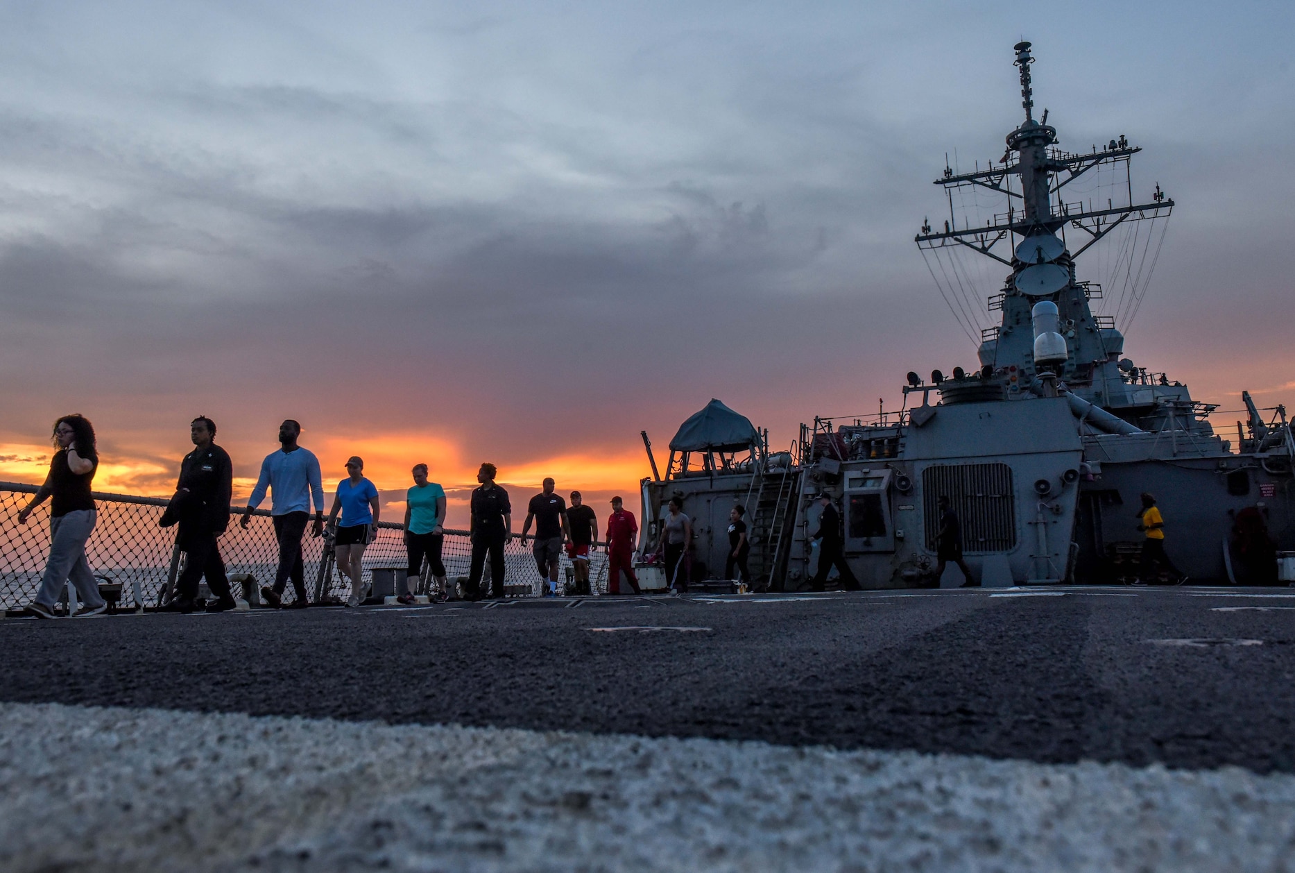 180422-N-ET513-0026 U.S. 5TH FLEET AREA OF OPERATIONS (April 22, 2018) Sailors participate in a sexual assault awareness and prevention silent walk on the flight deck of the guided-missile destroyer USS Laboon (DDG 58). Laboon is deployed to the U.S. 5th Fleet area of operations in support of maritime security operations to reassure allies and partners and preserve the freedom of navigation and the free flow of commerce in the region. (U.S. Navy photo by Mass Communication Specialist 3rd Class Kallysta Castillo/Released)
