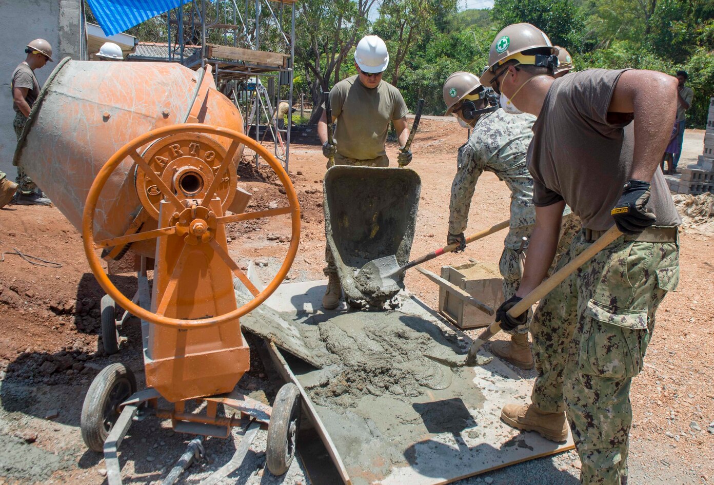 180425-N-NH199-0250 TRINCOMOLEE, Sri Lanka (April 26, 2018) Joint service members assigned to U.S. Navy hospital ship USNS Mercy (T-AH 19) and Naval Mobile Construction Battalion (NMCB) 5, mix stucco at a construction site during an engineering exchange in support of Pacific Partnership (PP) 2018. PP-18's mission is to work collectively with host and partner nations to enhance regional interoperability and disaster response capabilities, increase stability and security in the region and foster new and enduring friendships across the Indo-Pacific region. (U.S. Navy photo by Mass Communication Specialist Seaman Harley K. Sarmiento/Released)