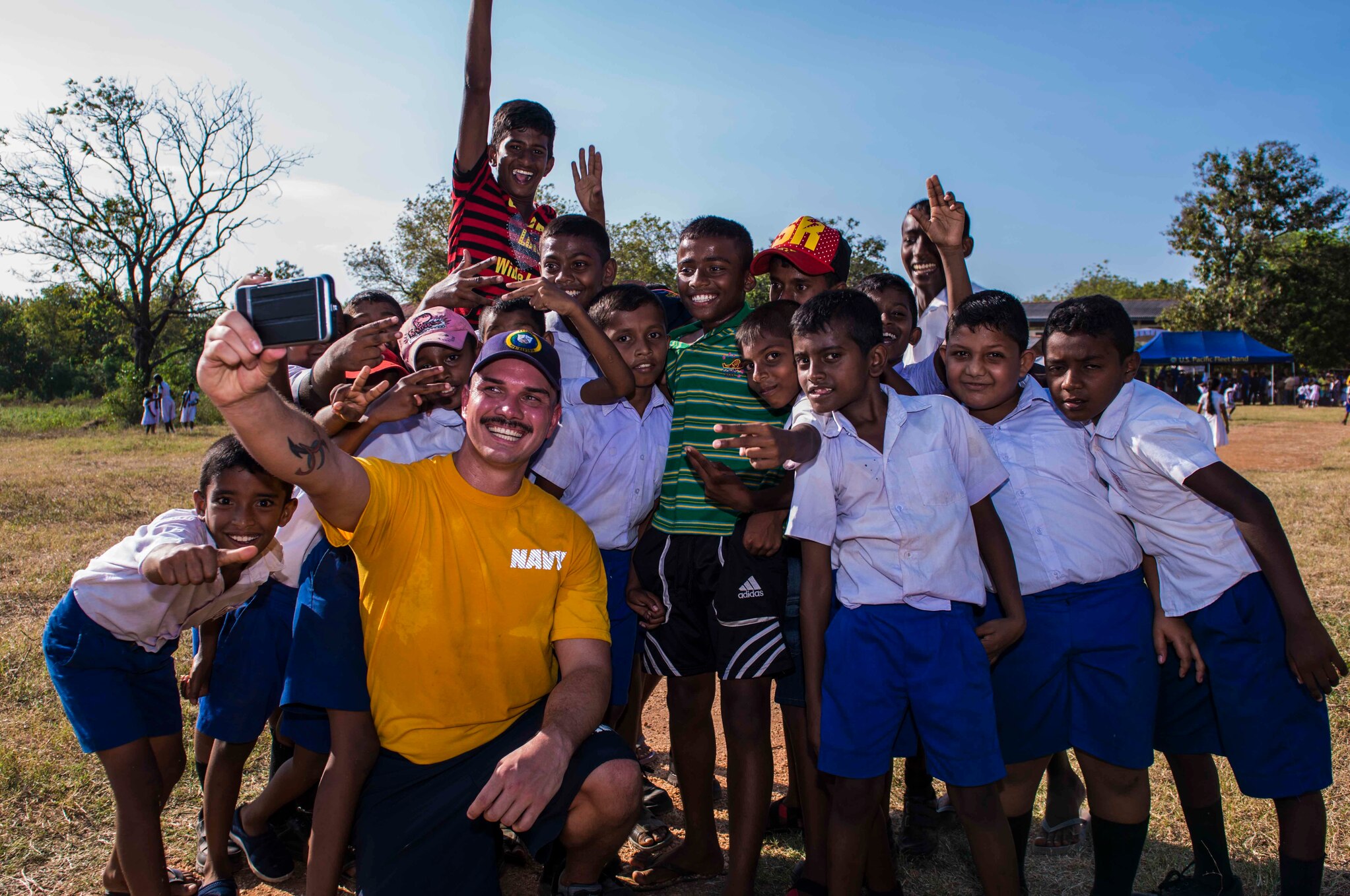 180427-N-FV739-167 TRINCOMALEE, Sri Lanka (April 27, 2018) - Hospital Corpsman 2nd Class Jacob Wilson, a Burbank, Wash. native assigned to Military Sealift Command hospital ship USNS Mercy (T-AH 19), takes a "selfie" with children at Jayanthipura Kantale Elementary School as part of a community relations event in support of Pacific Partnership 2018 (PP18). PP18’s mission is to work collectively with host and partner nations to enhance regional interoperability and disaster response capabilities, increased stability and security in the region, and foster new and enduring friendships across the Indo-Pacific Region. Pacific Partnership, now in its 13th iteration, is the largest annual multinational humanitarian assistance and disaster relief preparedness mission conducted in the Indo-Pacific. (U.S. Navy photo by Mass Communication Specialist 3rd Class Christopher A. Veloicaza)
