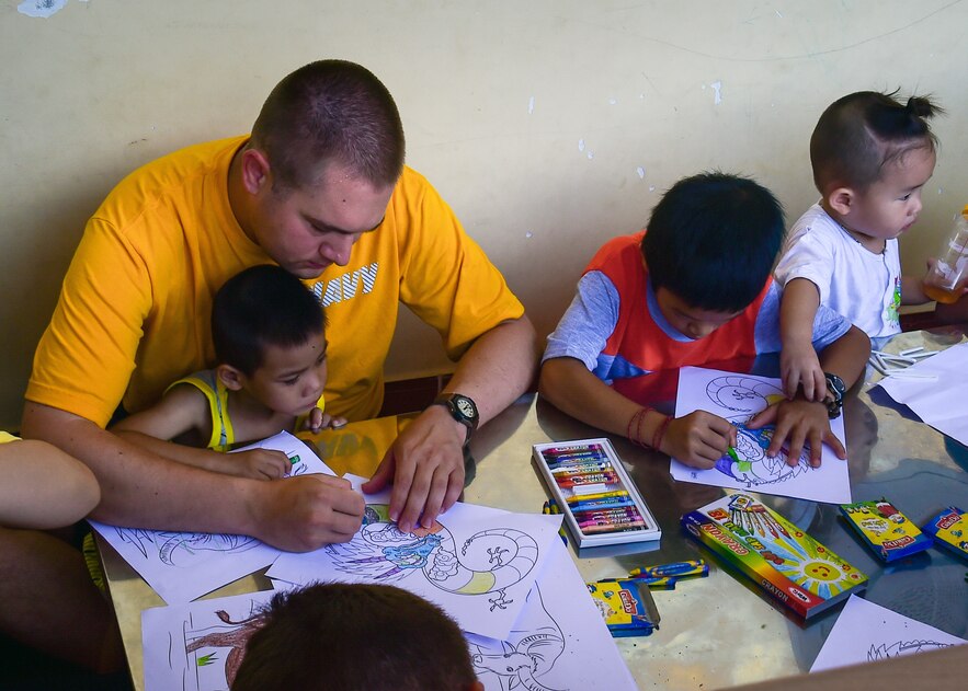 180520-N-QV906-0025 NHA TRANG, Vietnam (May 20, 2018) Hospital Corpsman 1st Class David Frandsen, assigned to the U.S. Navy hospital ship USNS Mercy (T-AH-19), colors with local school children during a community outreach event. Mercy is deployed in support of Pacific Partnership (PP) 2018, whose mission is to work collectively with host and partner nations to enhance regional interoperability and disaster response capabilities, increase stability and security in the region and foster new and enduring friendships across the Indo-Pacific region. (U.S. Navy photo by Mass Communication Specialist 1st Class Micah Blechner/Released)