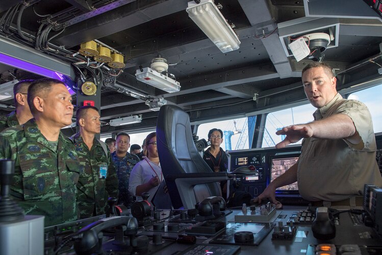 180520-N-ZW825-0391 SATTAHIP, Thailand (May 20, 2018) Capt. Charles Black, ship's master of Military Sealift Command expeditionary fast transport ship USNS Brunswick (T-EPF 6), explains the ship's bridge functions during a distinguished visitor and media tour following the opening ceremony for PP18 mission stop Thailand, May 20. PP18’s mission is to work collectively with host and partner nations to enhance regional interoperability and disaster response capabilities, increase stability and security in the region, and foster new and enduring friendships across the Indo-Pacific Region. Pacific Partnership, now in its 13th iteration, is the largest annual multinational humanitarian assistance and disaster relief preparedness mission conducted in the Indo-Pacific. (U.S. Navy photo by Mass Communication Specialist 1st Class Byron C. Linder/Released)