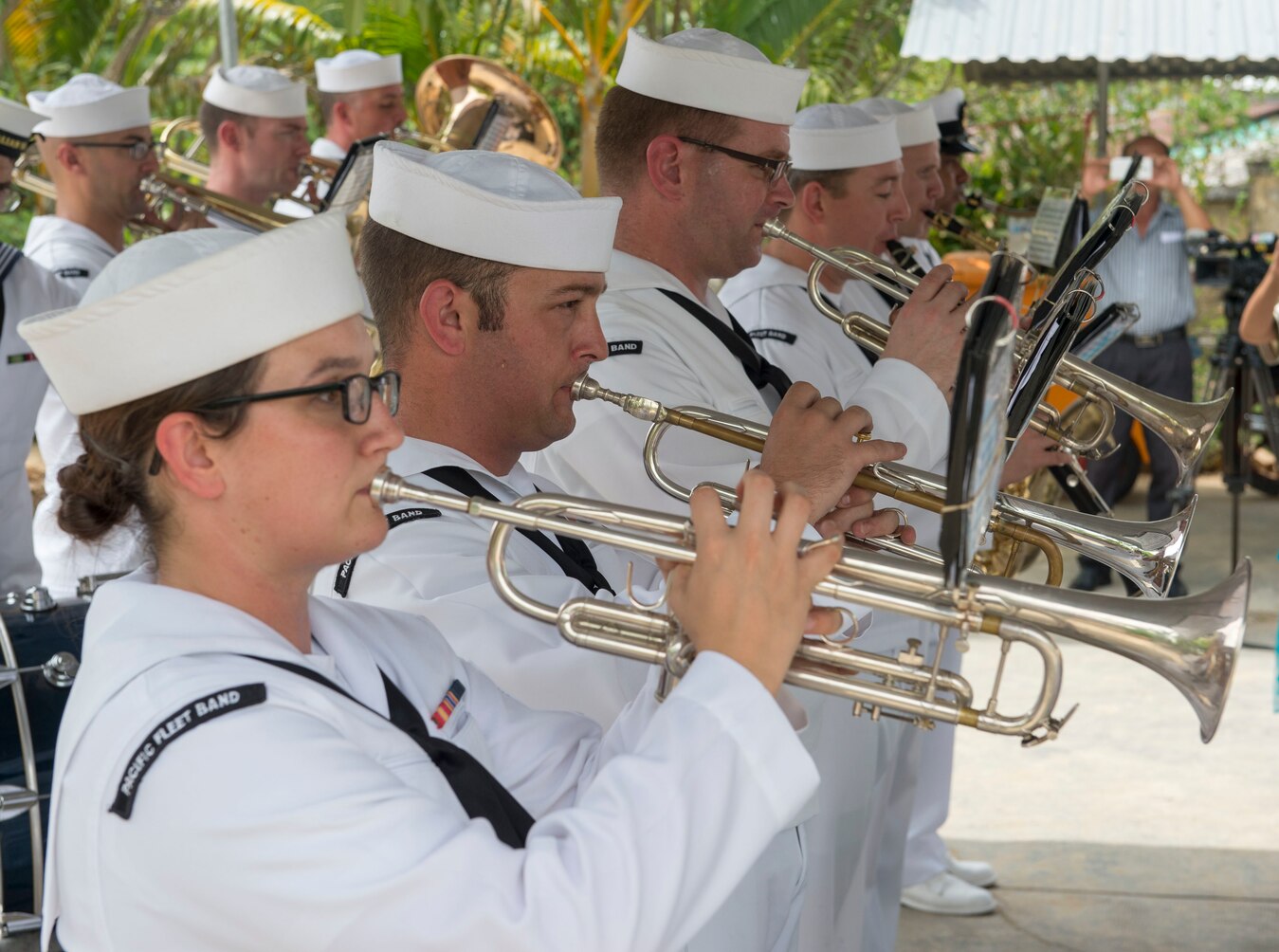 180531-N-MD713-0005 NHA TRANG, Vietnam (May 31, 2018) Sailors assigned to the U.S. Pacific Fleet Band perform at a ribbon cutting ceremony for Dien Dong Medical Clinic where joint service members worked with local Vietnamese to make renovations and repairs over a 10-day period in support of Pacific Partnership 2018 (PP18). PP18’s mission is to work collectively with host and partner nations to enhance regional interoperability and disaster response capabilities, increase stability and security in the region, and foster new and enduring friendships across the Indo-Pacific Region. Pacific Partnership, now in its 13th iteration, is the largest annual multinational humanitarian assistance and disaster relief preparedness mission conducted in the Indo-Pacific. (U.S. Navy photo by Mass Communication Specialist 3rd Class Cameron Pinske/Released)