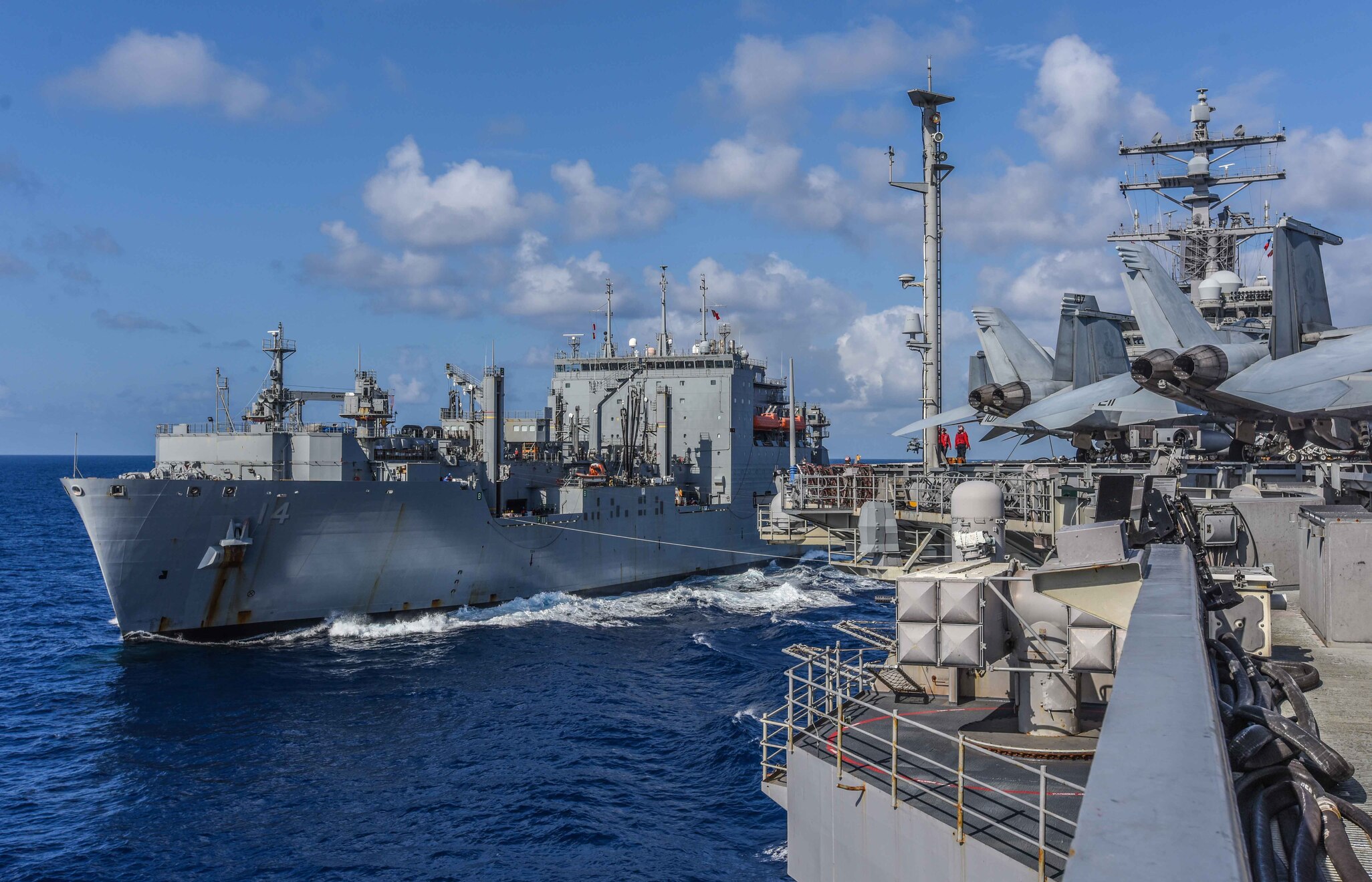 180604-N-PJ626-0003 WATERS SOUTH OF JAPAN (June 4, 2018) The Military Sealift Command dry cargo and ammunition ship USNS Charles Drew (T-AKE 10) steams alongside the Navy's forward-deployed aircraft carrier, USS Ronald Reagan (CVN 76), during a replenishment at sea. Ronald Reagan, the flagship of Carrier Strike Group 5, provides a combat-ready force that protects and defends the collective maritime interests of its allies and partners in the Indo-Pacific region. (U.S. Navy photo by Mass Communication Specialist 2nd Class Kaila Peters)