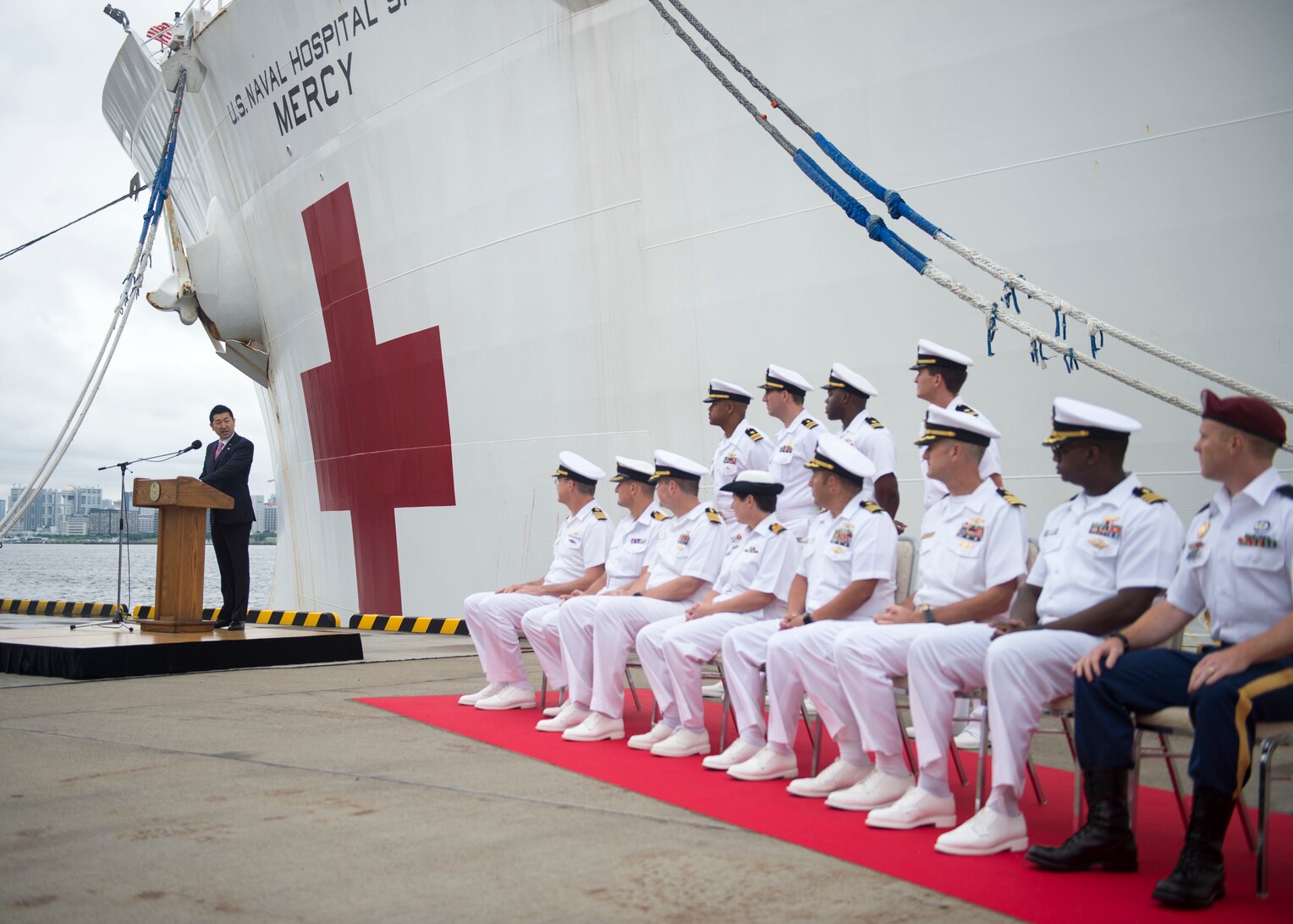 180616-N-VG727-1171 TOKYO (June 16, 2018) Jiro Akama, Japan State Minister of Cabinet, addresses U.S. and allied military leaders during a welcome ceremony for the Military Sealift Command hospital ship USNS Mercy (T-AH 19), following the ship's arrival in Tokyo. Mercy is making port visits to Tokyo to promote relationships between U.S. Navy Sailors and Japanese citizens through cultural exchange and bilateral training. (U.S. Navy photo by Mass Communication Specialist 2nd Class William Collins III/Released)