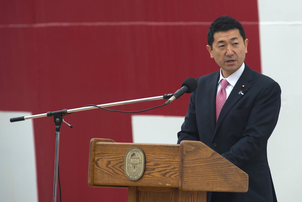 180616-N-WM647-139 TOKYO (June 16, 2018) Jiro Akama, state minister of cabinet office, delivers remarks during a welcome ceremony for the Military Sealift Command hospital ship USNS Mercy (T-AH 19) following the ship's arrival in Tokyo. Mercy is making port visits to Yokosuka and Tokyo to promote relationships between U.S. Navy Sailors and Japanese citizens through cultural exchange and bilateral training. (U.S. Navy photo by Mass Communication Specialist 2nd Class Elesia K. Patten/Released)