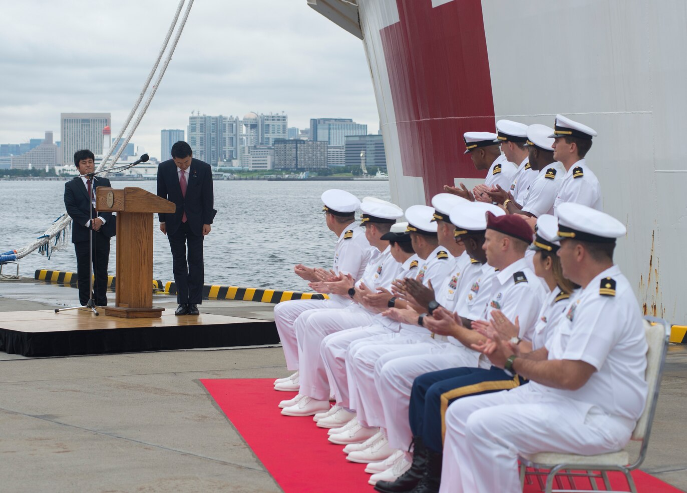 180616-N-WM647-143 TOKYO (June 16, 2018) Jiro Akama, state minister of cabinet office, bows after delivering his opening remarks during a welcome ceremony for the Military Sealift Command hospital ship USNS Mercy (T-AH 19) following the ship's arrival in Tokyo. Mercy is making port visits to Yokosuka and Tokyo to promote relationships between U.S. Navy Sailors and Japanese citizens through cultural exchange and bilateral training. (U.S. Navy photo by Mass Communication Specialist 2nd Class Elesia K. Patten/Released)