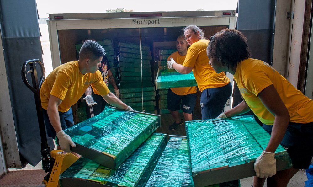 180618-N-OH958-0133 NORFOLK, Va. (June 18, 2018) Sailors assigned to the aircraft carrier USS George H.W. Bush (CVN 77) help move supplies at Norfolk, Virginia Public Library Commission. As a birthday tribute to the ship's namesake, and representing his famous "Thousand Points of Light" speech, approximately 1,000 GHWB crew members took part in one of the largest single-day community relation (COMREL) events at 44 different locations throughout the Hampton Roads area. George H.W. Bush turned 94 on June 12. (U.S. Navy photo by Mass Communication Specialist Seaman Apprentice Ryan Pitt/Released)