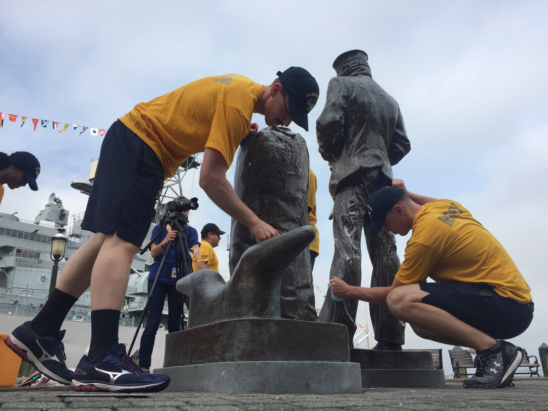 180618-N-VU442-0005 NORFOLK (June 18, 2018) Sailors assigned to the aircraft carrier USS George H.W. Bush (CVN 77) clean the Lone Sailor statue at Norfolk’s Town Point Park. As a birthday tribute to the ship’s namesake, and representing his famous “Thousand Points of Light” speech, approximately 1,000 GHWB crew members took part in one of the largest single-day community relation (COMREL) events at 44 different locations throughout the Hampton Roads area. George H.W. Bush turned 94 on June 12. (U.S. Navy photo by Senior Chief Mass Communication Specialist Mike Jones/Released)