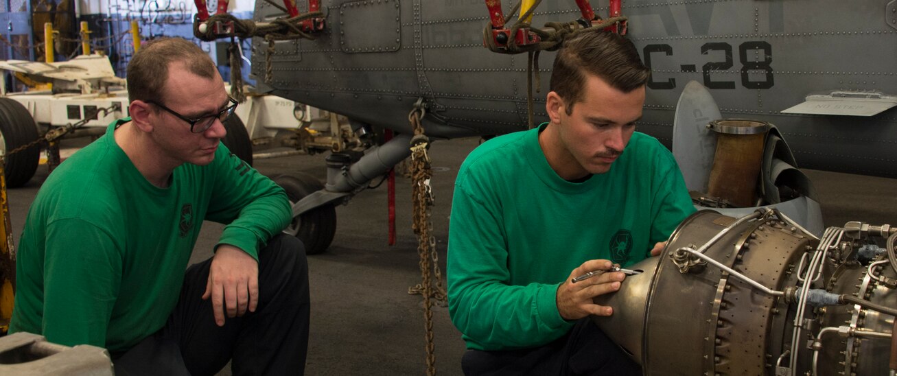 180715-N-AZ467-0006 U.S. 5TH FLEET AREA OF OPERATIONS (July 15, 2018) Aviation Machinist Mate 2nd Class Kyle Buchanan, right, from Panama City Beach, Fla., and Logistics Specialist 2nd Class Tyson Williams, from Parkersburg, W.Va., assigned to Helicopter Sea Combat Squadron (HSC) 28, assemble the cone-exhaust on the motor of an MH-60S Sea Hawk in the hangar bay of the amphibious assault ship USS Iwo Jima (LHD 7), July 15th, 2018. Iwo Jima, homeported in Mayport, Fla., is on deployment to the U.S. 5th Fleet area of operations in support of maritime security operations to reassure allies and partners, and preserve the freedom of navigation and the free flow of commerce in the region. (U.S. Navy photo by Mass Communication Specialist Seaman Apprentice Travis Baley/Released)