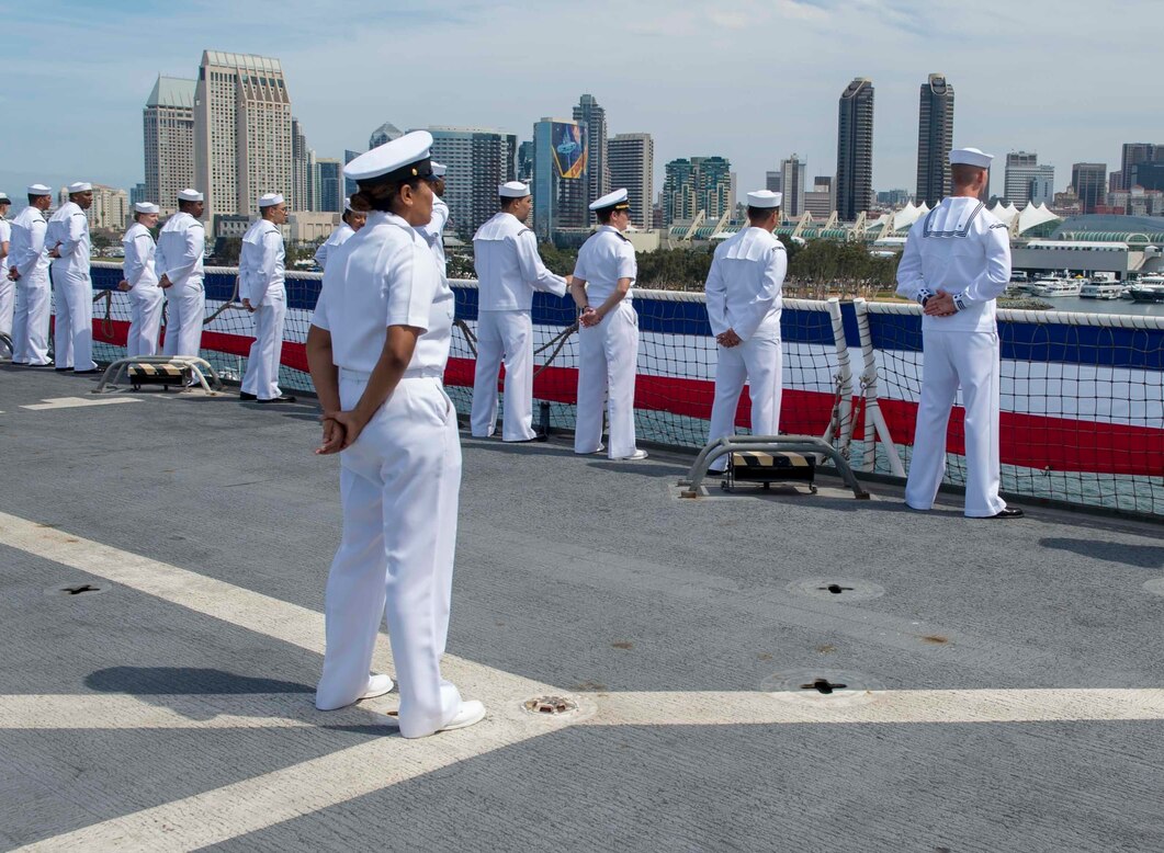 180721-N-NH199-0035 SAN DIEGO (July 21, 2018) Sailors assigned to Military Sealift Command hospital ship USNS Mercy (T-AH 19), man the rails as the ship arrives at Naval Base San Diego after deploying in support of Pacific Partnership 2018 and participating in the 2018 Rim of the Pacific exercise. Mercy provides emergency, on-site care for U.S. combatant forces deployed in war and other operations. The hospital ship’s secondary mission is to provide full hospital services to support U.S. disaster relief and humanitarian operations worldwide. Twenty-five nations, 46 ships, five submarines, about 200 aircraft, and 25,000 personnel are participating in RIMPAC from June 27 to Aug. 2 in and around the Hawaiian Islands and Southern California. The world’s largest international maritime exercise, RIMPAC provides a unique training opportunity while fostering and sustaining cooperative relationships among participants critical to ensuring the safety of sea lanes and security of the world’s oceans. RIMPAC 2018 is the 26th exercise in the series that began in 1971. (U.S. Navy photo by Mass Communication Specialist Seaman Harley K. Sarmiento/Released)