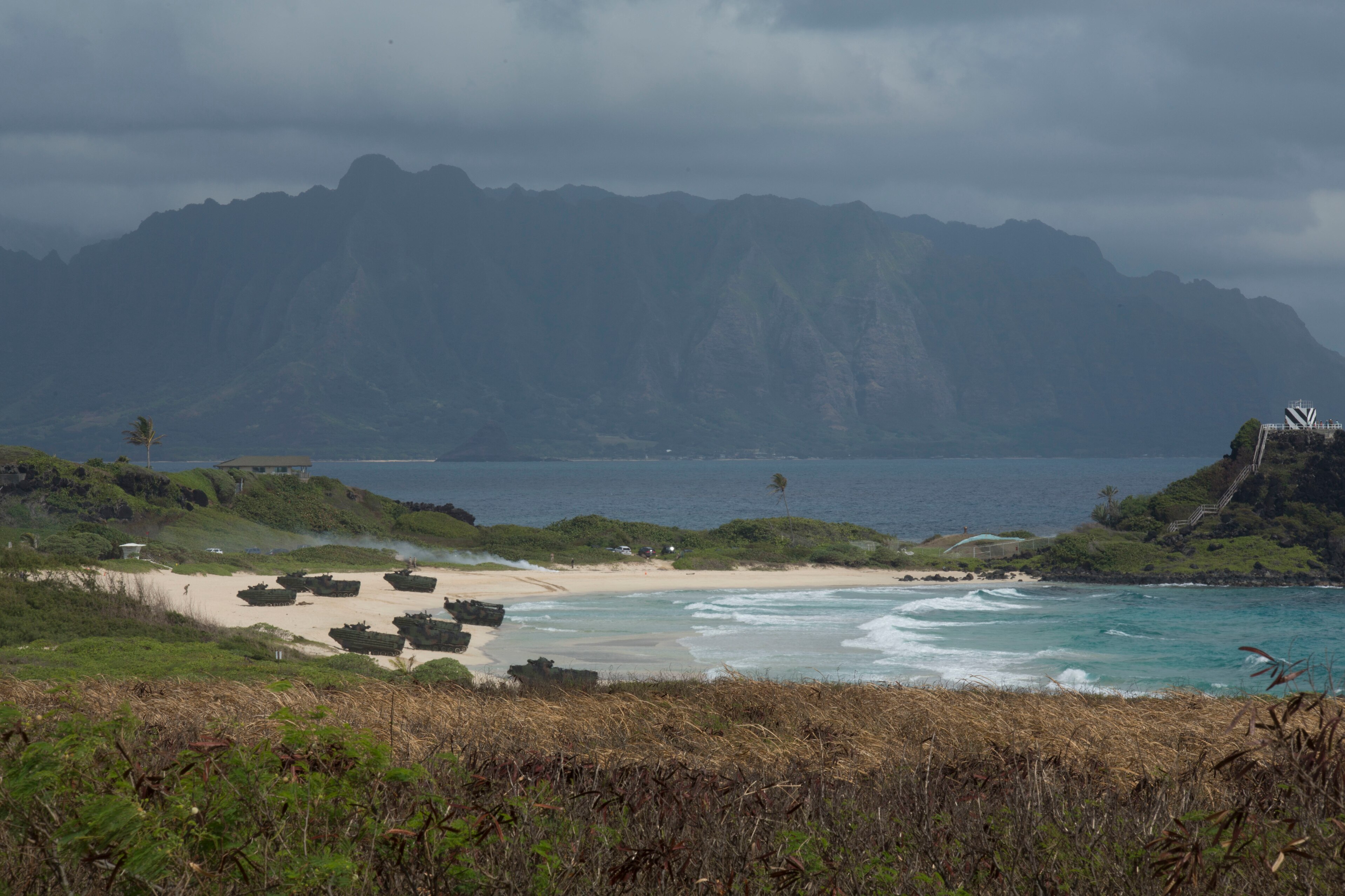 180729-M-KC456-1005 MARINE CORPS BASE HAWAII (July 29, 2018) U.S. Marine Corps AAV-P7/A1 assault amphibious vehicles land at Pyramid Rock Beach during an amphibious landing demonstration as part of Rim of the Pacific (RIMPAC) exercise on Marine Corps Base Hawaii, July 29, 2018. RIMPAC provides high-value training for task organized, highly capable Marine Air-Ground Task Force and enhances the critical crisis response capability of U.S. Marines in the Pacific. Twenty-Five nations, 46 ships, five submarines, about 200 aircraft, and 25,000 personnel are participating in RIMPAC from June 27 to Aug. 2 in and around the Hawaiian Islands and Southern California. (U.S. Marine Corps photo by Lance Cpl. Thomas P. Miller/Released)