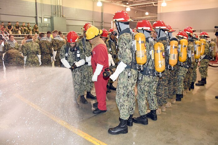 180802-N-IK959-1964 GREAT LAKES, Ill. (Aug. 2, 2018) Naval Reserve Officers Training Corps (NROTC) midshipman candidates prepare to fight a fire in a simulated shipboard compartment in the USS Chief Recruit Fire Fighter Trainer at Recruit Training Command (RTC). More than 65 young men and women entering their freshman year of the NROTC program participated in a two-week pilot program designed to provide standardized entry-level militarization and prepare new NROTC midshipmen with a common training orientation. USS Chief was used as part of their final evaluation, during which they had to complete several tasks in different RTC training facilities in a timely manner, working as a team. The indoctrination serves as a standard training launch point for the future naval and Marine Corps officers, and for the development of their character and professional competence. (U.S. Navy photo by Scott A. Thornbloom)