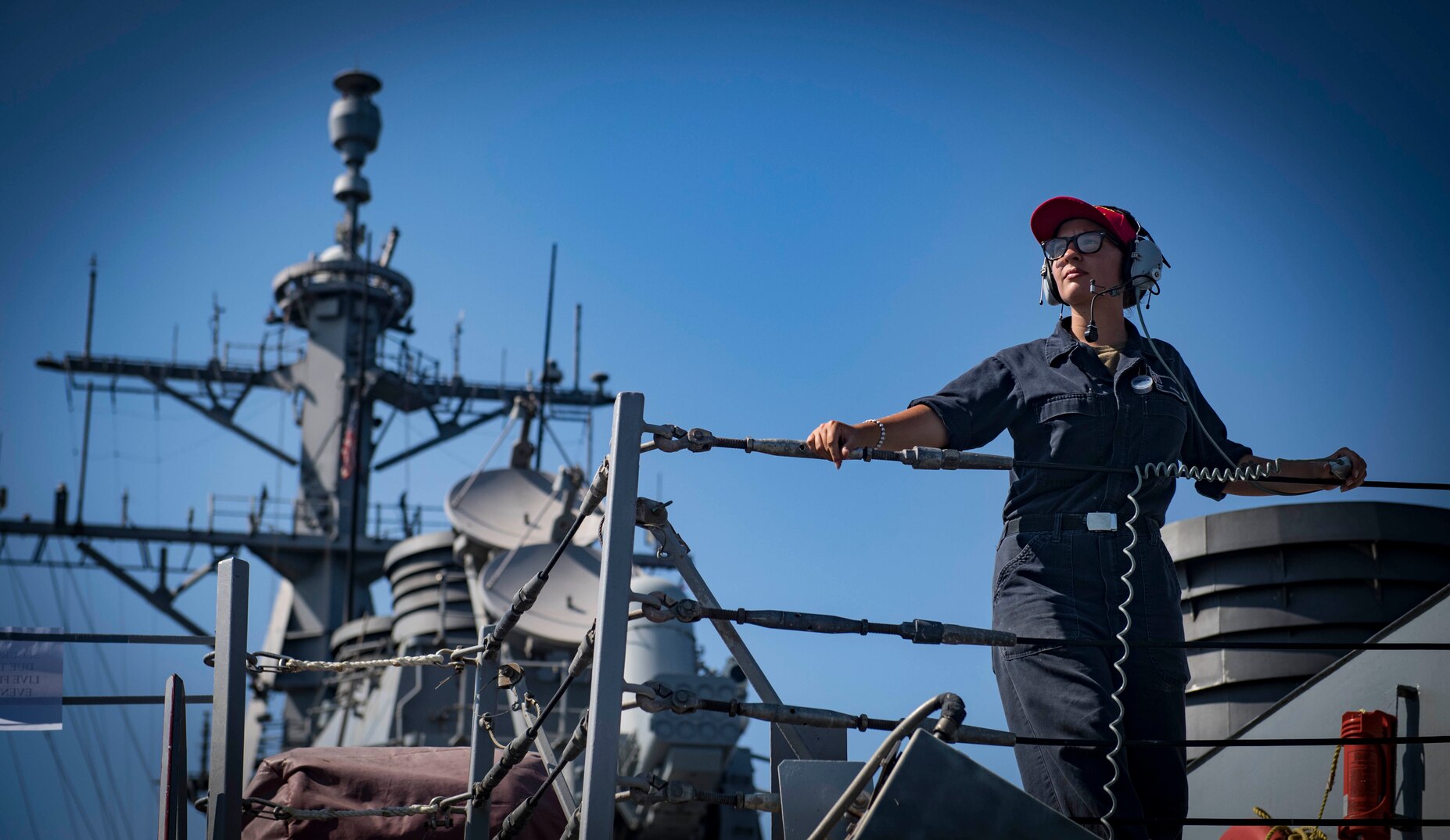 180820-N-UY653-249 BLACK SEA (Aug. 20, 2018) Seaman Samantha Braband stands aft lookout watch aboard the Arleigh Burke-class guided-missile destroyer USS Carney (DDG 64), Aug. 20, 2018. Carney, forward-deployed to Rota, Spain, is on its fifth patrol in the U.S. 6th Fleet area of operations in support of regional allies and partners as well as U.S. national security interests in Europe and Africa. (U.S. Navy photo by Mass Communication Specialist 1st Class Ryan U. Kledzik/Released)