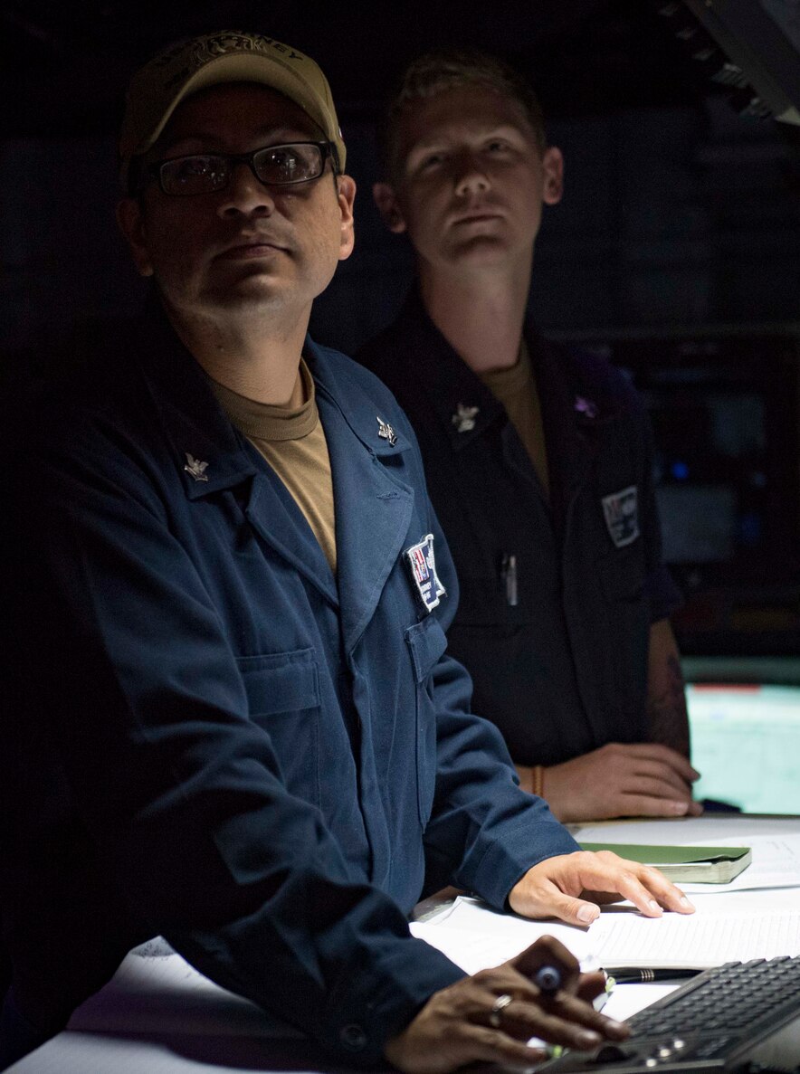 180821-N-UY653-230 BLACK SEA (Aug. 21, 2018) Operations Specialist 2nd Class Joseph Pacheco, left, and Operations Specialist 1st Class Jacob Smith stand watch in the combat information center aboard the Arleigh Burke-class guided-missile destroyer USS Carney (DDG 64), Aug. 21, 2018. Carney, forward-deployed to Rota, Spain, is on its fifth patrol in the U.S. 6th Fleet area of operations in support of regional allies and partners as well as U.S. national security interests in Europe and Africa. (U.S. Navy photo by Mass Communication Specialist 1st Class Ryan U. Kledzik/Released)