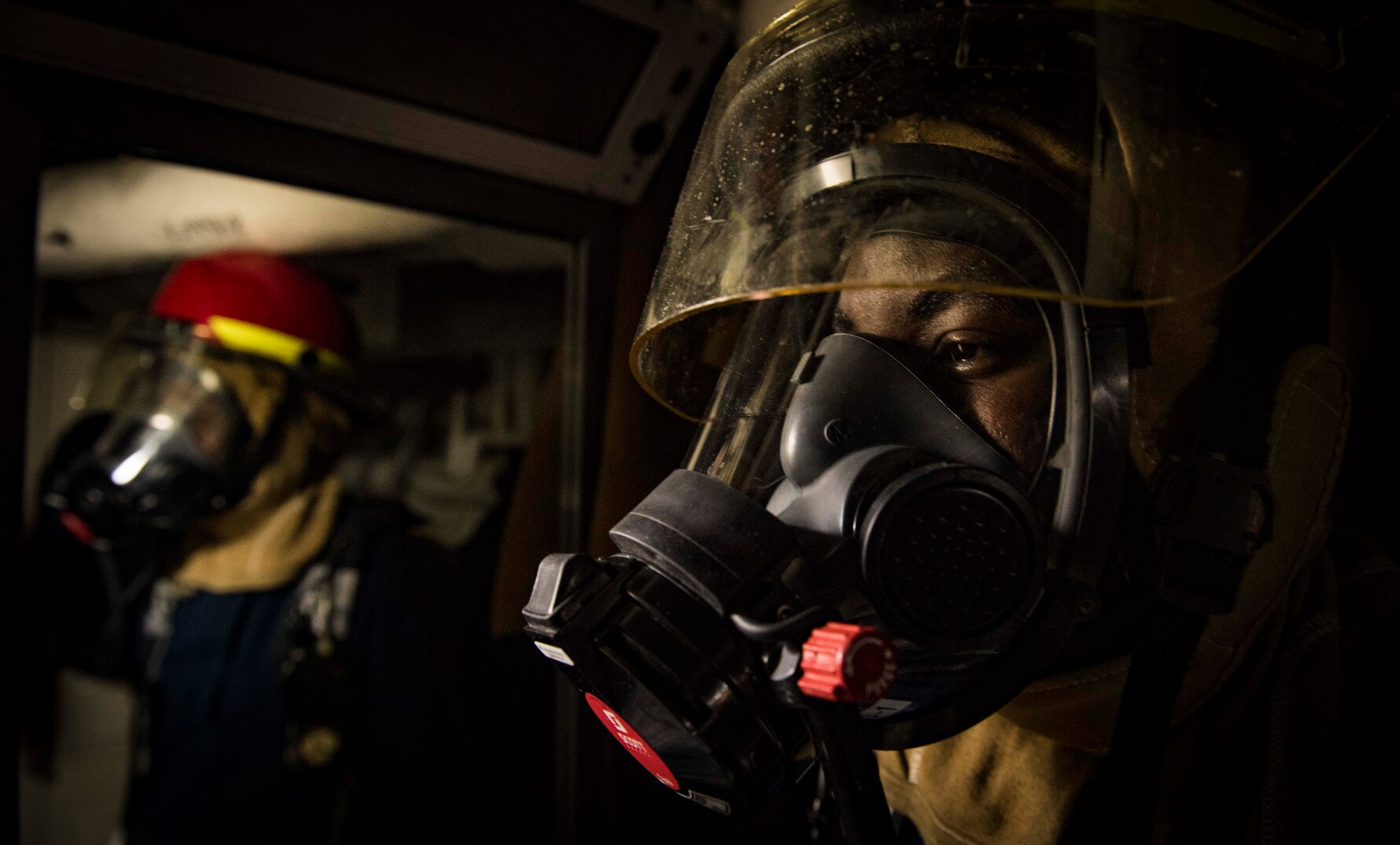 180821-N-UY653-270 BLACK SEA (Aug. 21, 2018) Damage Controlman Fireman Maurice Cossy stands boundaryman watch during a damage control training exercise aboard the Arleigh Burke-class guided-missile destroyer USS Carney (DDG 64), Aug. 21, 2018. Carney, forward-deployed to Rota, Spain, is on its fifth patrol in the U.S. 6th Fleet area of operations in support of regional allies and partners as well as U.S. national security interests in Europe and Africa. (U.S. Navy photo by Mass Communication Specialist 1st Class Ryan U. Kledzik/Released)