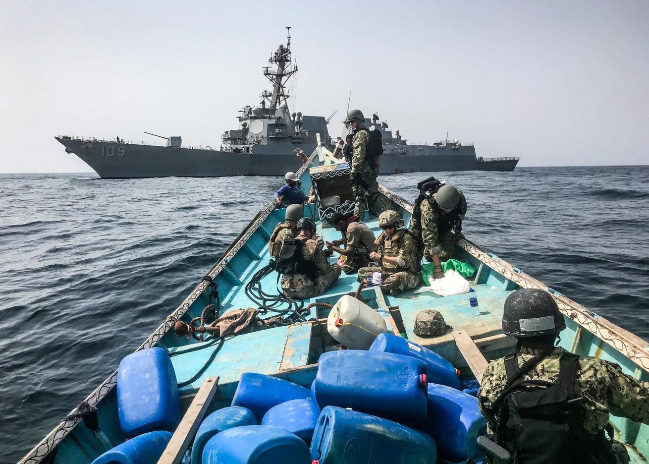 180828-N-N0146-6858 GULF OF ADEN (Aug. 28, 2018) A visit, board, search and seizure team from the guided-missile destroyer USS Jason Dunham (DDG 109) inspects a skiff as part of maritime security operations. The stateless skiff was found carrying a shipment of over 1,000 illicit weapons. Jason Dunham is deployed to the U.S. 5th Fleet area of operations in support of naval operations to ensure maritime stability and security in the Central Region, connecting the Mediterranean and the Pacific through the western Indian Ocean and three strategic choke points. (U.S. Navy photo /Released)
