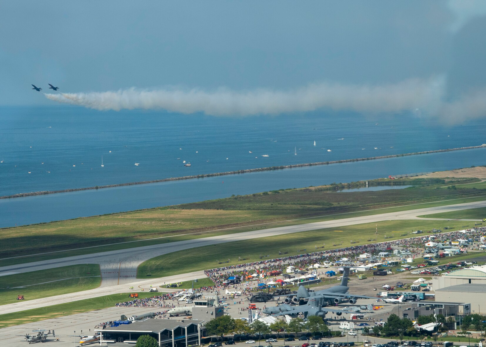 180901-N-RJ834-457 CLEVELAND (Sept. 1, 2018) The U.S. Navy flight demonstration squadron, the Blue Angels, perform during the Cleveland Air Show at Burke Lakefront Airport during Cleveland Navy Week. The Navy Office of Community Outreach uses the Navy Week program to bring Navy Sailors, equipment and displays to approximately 14 American cities each year for a week-long schedule of outreach engagements designed for Americans to experience firsthand how the U.S. Navy is the Navy the nation needs. (U.S. Navy photo by Mass Communication Specialist 2nd Class Tamara Vaughn/Released)
