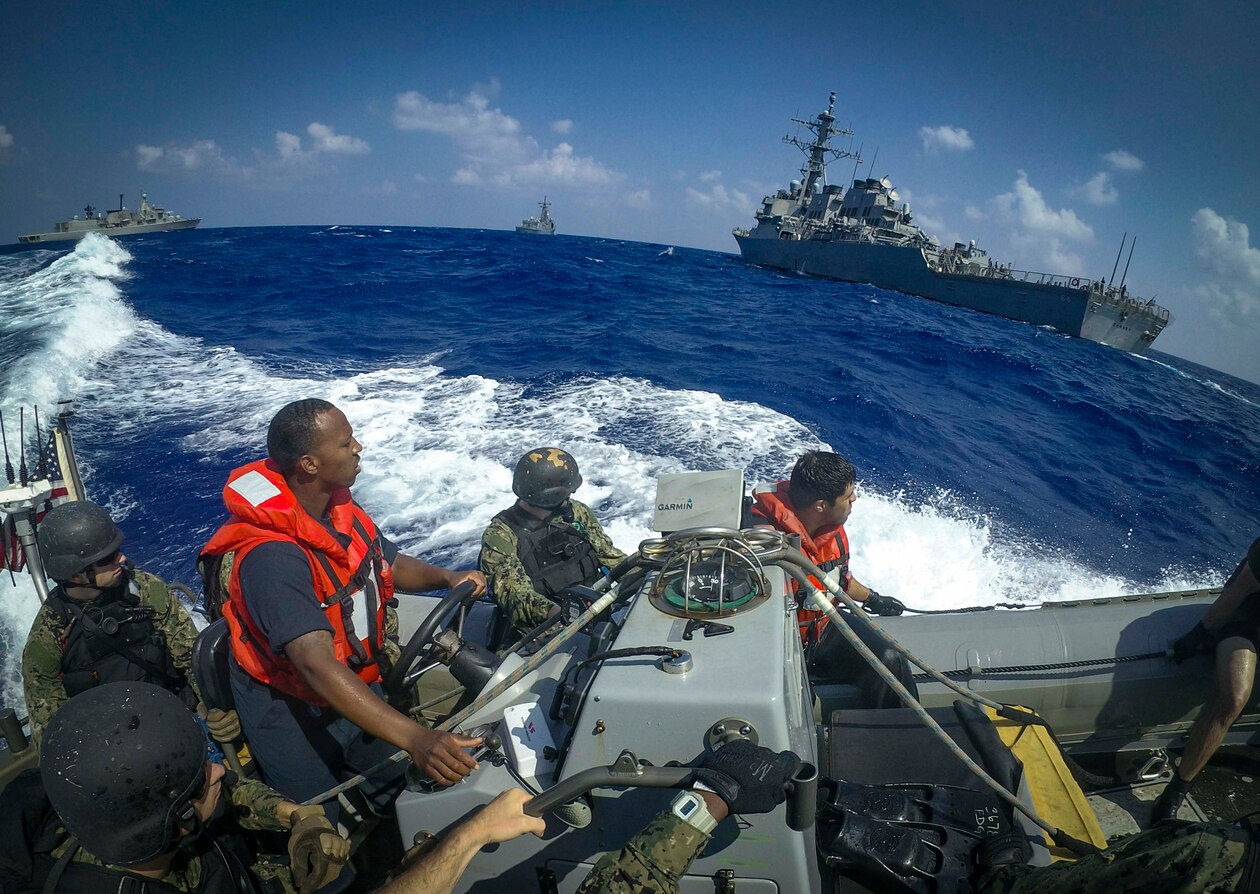 180910-N-UY653-067 MEDITERRANEAN SEA (Sept. 10, 2018) Sailors assigned to the Arleigh Burke-class guided-missile destroyer USS Carney (DDG 64) maneuver a rigid-hull inflatable boat alongside the Hellenic navy Elli-class frigate HS Limnos (F 451), left, the Egyptian Naval Force guided-missile frigate Sharm El Sheikh (FFG 901), center, and Carney, while participating in visit, board, search and seizure training during Exercise Bright Star 2018. Bright Star is a multilateral U.S. Central Command exercise held with the Arab Republic of Egypt focused on responding to modern-day security scenarios. U.S. Navy and coalition assets are participating in numerous exercises, such as Bright Star, as part of the greater Theater Counter Mine and Maritime Security Exercise to ensure maritime stability and security in the Central Region, connecting the Mediterranean and Pacific through the western Indian Ocean and three strategic choke points. (U.S. Navy photo by Mass Communication Specialist 1st Class Ryan U. Kledzik/Released)