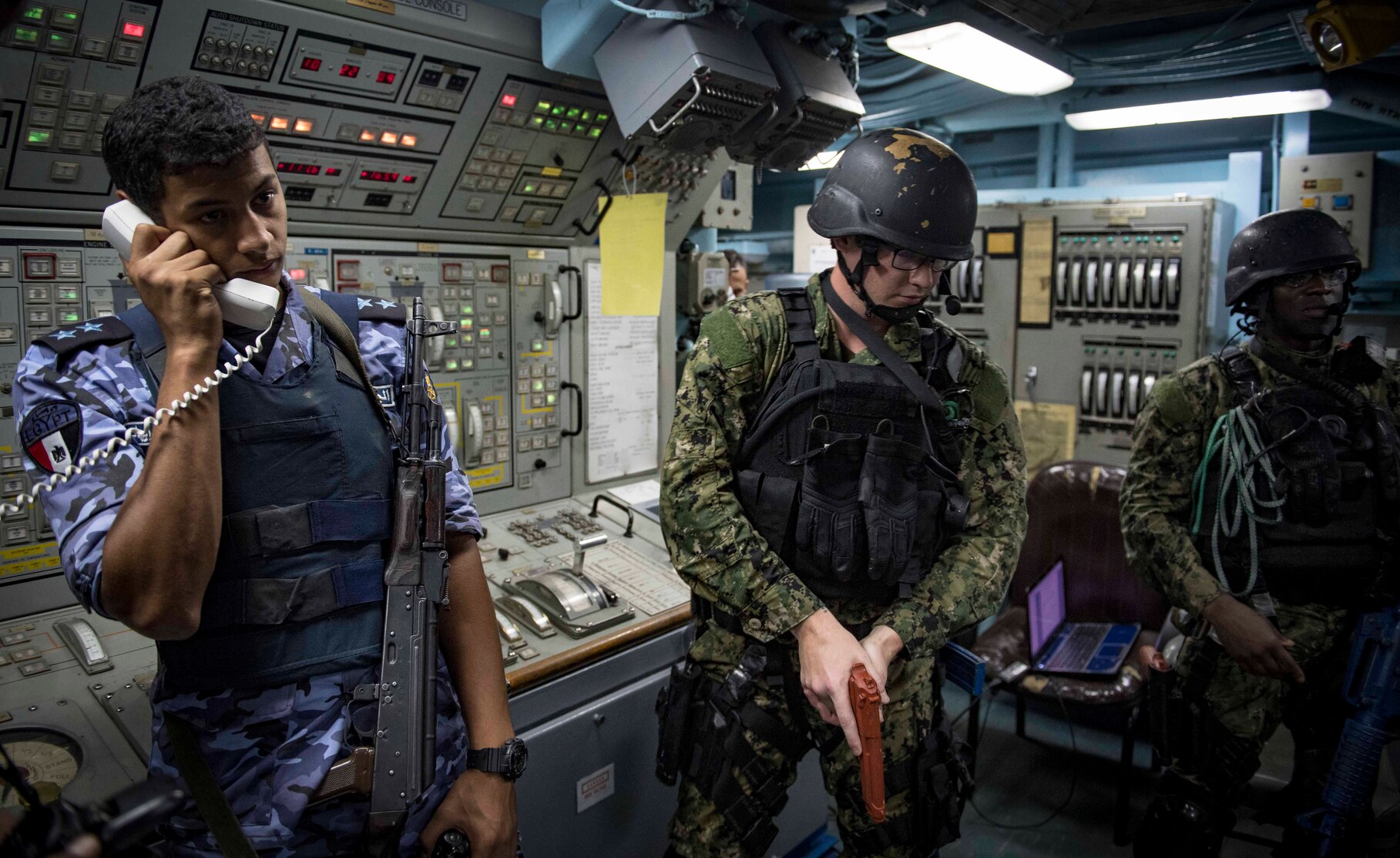 180910-N-UY653-138 MEDITERRANEAN SEA (Sept. 10, 2018) Sailors assigned to the Arleigh Burke-class guided-missile destroyer USS Carney (DDG 64) and Egyptian sailors participate in visit, board, search and seizure (VBSS) training aboard the Egyptian Naval Force guided-missile frigate Sharm El Sheikh (FFG 901) during Exercise Bright Star 2018. Bright Star is a multilateral U.S. Central Command exercise held with the Arab Republic of Egypt focused on responding to modern-day security scenarios. U.S. Navy and coalition assets are participating in numerous exercises, such as Bright Star, as part of the greater Theater Counter Mine and Maritime Security Exercise to ensure maritime stability and security in the Central Region, connecting the Mediterranean and Pacific through the western Indian Ocean and three strategic choke points. (U.S. Navy photo by Mass Communication Specialist 1st Class Ryan U. Kledzik/Released)