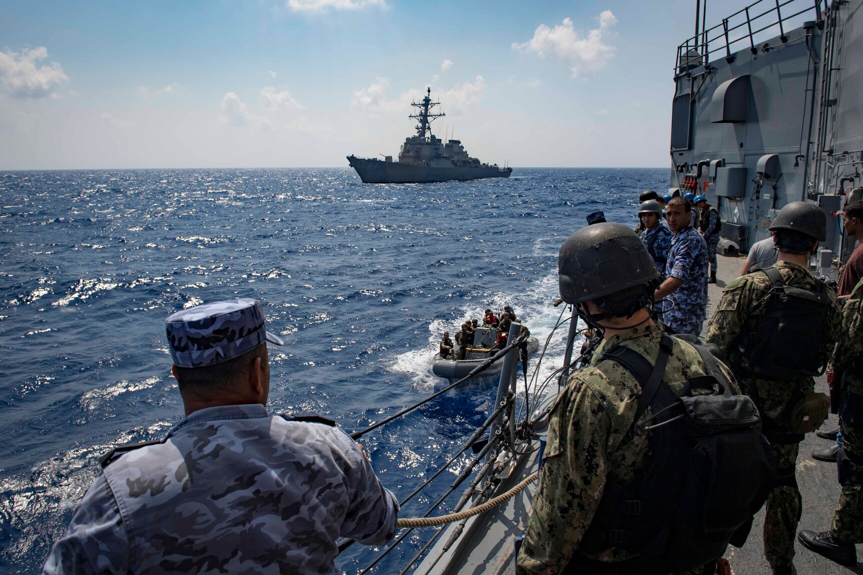 180910-N-UY653-234 MEDITERRANEAN SEA (Sept. 10, 2018) Sailors assigned to the Arleigh Burke-class guided-missile destroyer USS Carney (DDG 64) maneuver a rigid-hull inflatable boat alongside the Egyptian Naval Force guided-missile frigate Sharm El Sheikh (FFG 901) while participating in visit, board, search and seizure training during Exercise Bright Star 2018. Bright Star is a multilateral U.S. Central Command exercise held with the Arab Republic of Egypt focused on responding to modern-day security scenarios. U.S. Navy and coalition assets are participating in numerous exercises, such as Bright Star, as part of the greater Theater Counter Mine and Maritime Security Exercise to ensure maritime stability and security in the Central Region, connecting the Mediterranean and Pacific through the western Indian Ocean and three strategic choke points. (U.S. Navy photo by Mass Communication Specialist 1st Class Ryan U. Kledzik/Released)