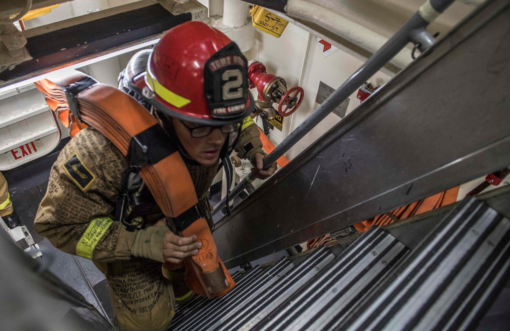 180911-N-UY653-166 MEDITERRANEAN SEA (Sept. 11, 2018) Damage Controlman 3rd Class Eric Leather participates in a ladder climb, Sept. 11, 2018, aboard the Arleigh Burke-class guided-missile destroyer USS Carney (DDG 64) in remembrance of the firefighters who lost their lives during the Sept. 11, 2001 terrorist attacks. Carney, forward-deployed to Rota, Spain, is on its fifth patrol in the U.S. 6th Fleet area of operations in support of regional allies and partners as well as U.S. national security interests in Europe and Africa. (U.S. Navy photo by Mass Communication Specialist 1st Class Ryan U. Kledzik/Released)