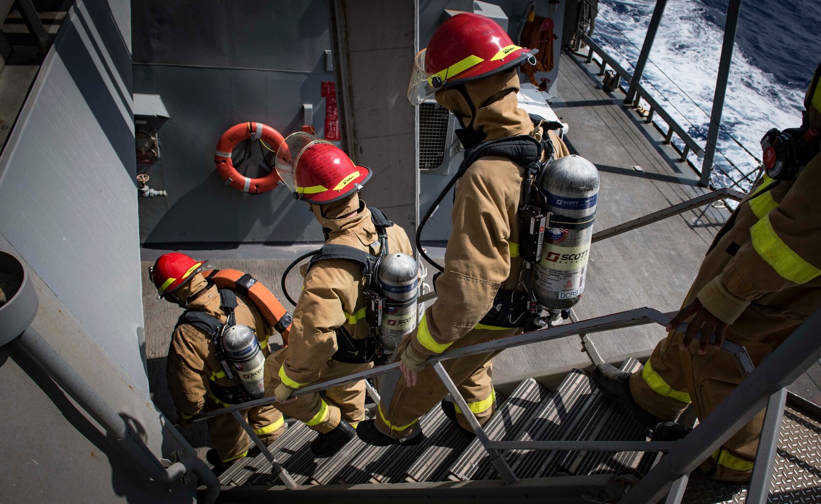 180911-N-UY653-197 MEDITERRANEAN SEA (Sept. 11, 2018) Sailors participate in a ladder climb aboard the Arleigh Burke-class guided-missile destroyer USS Carney (DDG 64) in rememberance of the firefighters who lost their lives during the Sept. 11, 2001 terrorist attacks. Carney, forward-deployed to Rota, Spain, is on its fifth patrol in the U.S. 6th Fleet area of operations in support of regional allies and partners as well as U.S. national security interests in Europe and Africa. (U.S. Navy photo by Mass Communication Specialist 1st Class Ryan U. Kledzik/Released)