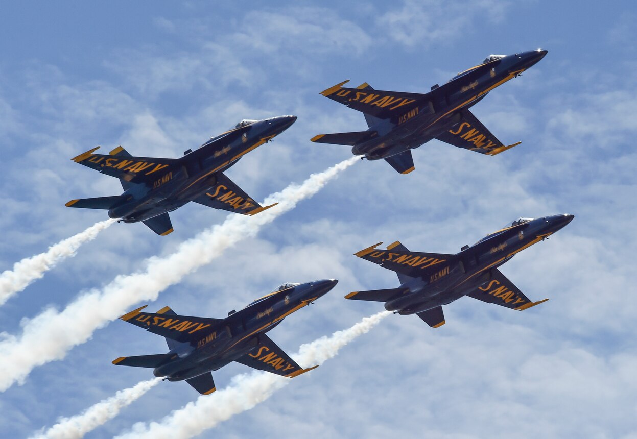180912-N-UK306-1130 PENSACOLA, Fla. (Sept. 12, 2018) The U.S. Navy flight demonstration squadron, the Blue Angels, Diamond pilots prepare for the "Low Break Cross" during a practice demonstration at Naval Air Station (NAS) Pensacola. The Blue Angels are scheduled to perform more than 60 demonstrations at more than 30 locations across the U.S. and Canada in 2018. (U.S. Navy photo by Mass Communication Specialist 2nd Class Timothy Schumaker/Released)