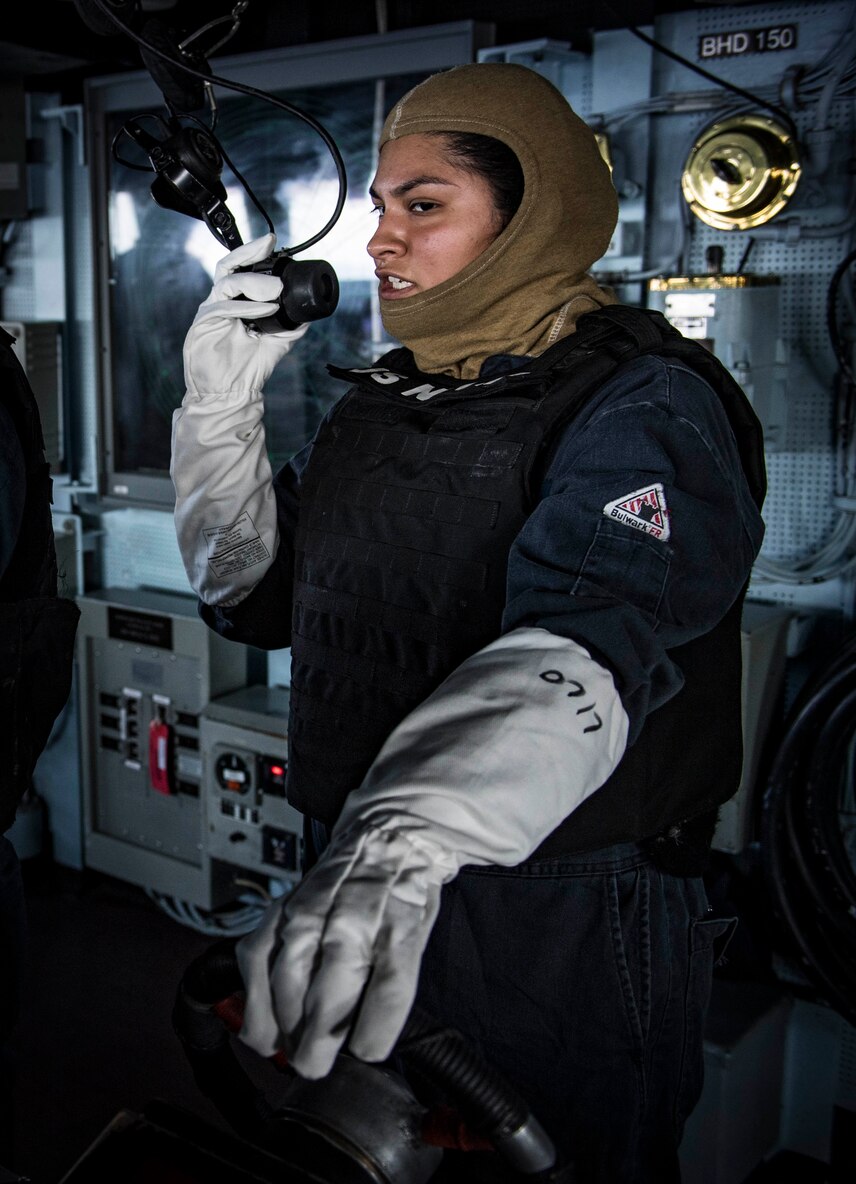 180917-N-UY653-008 MEDITERRANEAN SEA (Sept. 17, 2018) Logistics Specialist 3rd Class Lisette Longoria mans the helm of the Arleigh Burke-class guided-missile destroyer USS Carney (DDG 64) during a general quarters drill, Sept. 17, 2018. Carney, forward-deployed to Rota, Spain, is on its fifth patrol in the U.S. 6th Fleet area of operations in support of regional allies and partners as well as U.S. national security interests in Europe and Africa. (U.S. Navy photo by Mass Communication Specialist 1st Class Ryan U. Kledzik/Released)