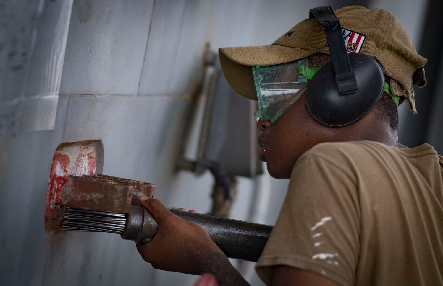 180918-N-UY653-007 MEDITERRANEAN SEA (Sept. 18, 2018) Gunner’s Mate 3rd Class Karen Handy performs preservation maintenance aboard the Arleigh Burke-class guided-missile destroyer ç, Sept. 18, 2018. Carney, forward-deployed to Rota, Spain, is on its fifth patrol in the U.S. 6th Fleet area of operations in support of regional allies and partners as well as U.S. national security interests in Europe and Africa. (U.S. Navy photo by Mass Communication Specialist 1st Class Ryan U. Kledzik/Released)