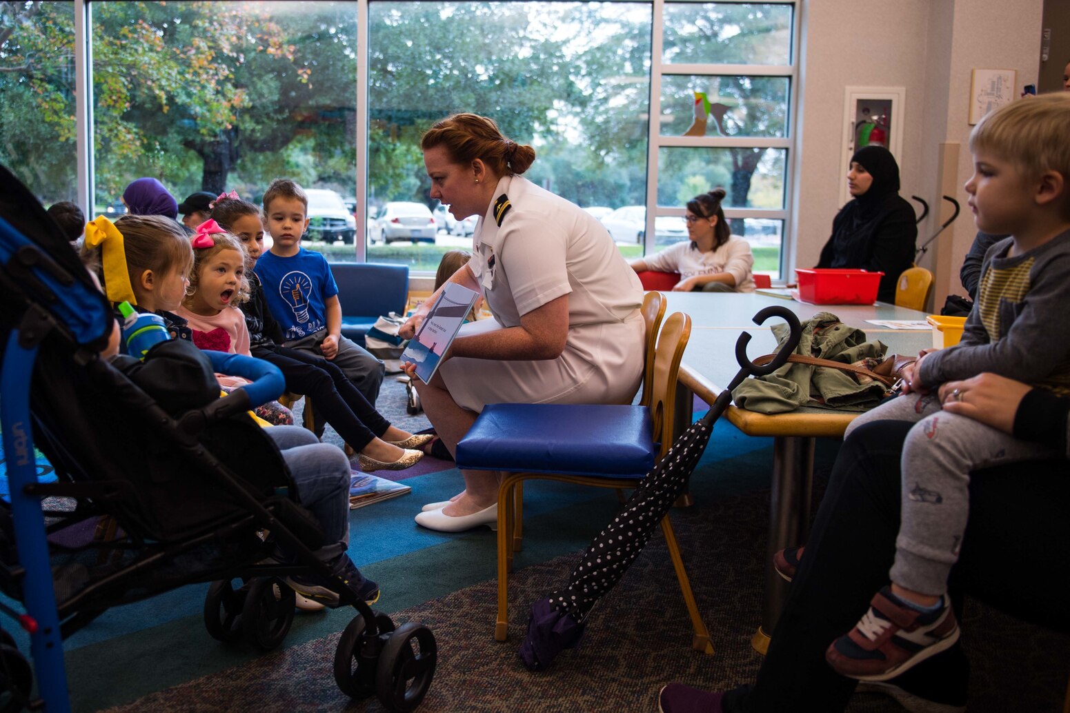 181101-N-SH284-1041 SHREVEPORT, La. (Nov. 1, 2018) Lt. Katherine Dawley, from Dover, N.H., assigned to the Ohio-class ballistic-missile submarine USS Louisiana (SSBN 743), reads a book to children during an interactive story time at the Shreve Memorial Library as part of Shreveport-Bossier City Navy Week, Nov. 1, 2018. Navy Weeks are designed to connect the public with Navy Sailors, programs and equipment throughout the country. Every year, America's Navy comes home to approximately 15 cities across the country to show Americans why having a strong Navy is critical to the American way of life. (U.S. Navy photo by Mass Communication Specialist 2nd Class Vaughan Dill/Released)