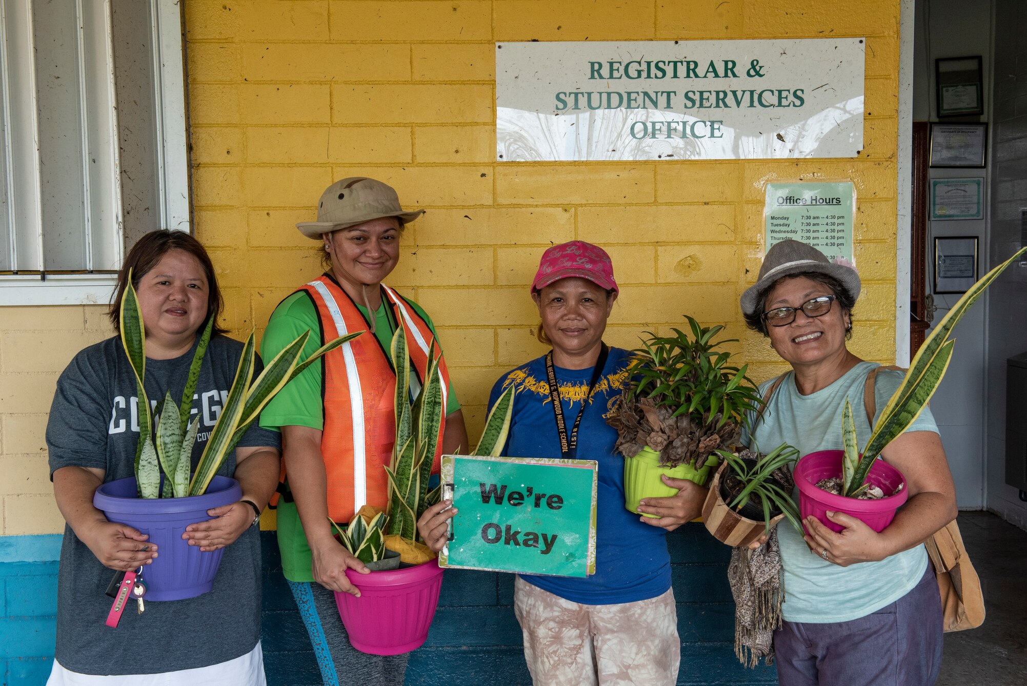 181102-F-ZM606-042 SAIPAN (Nov. 2, 2018) Four educators from Admiral Herbert G. Hopwood Middle School in Saipan, pose for a photo, Nov. 2, 2018. The ladies mentioned the room that housed their plants was destroyed by Super Typhoon Yutu, but the plants remained untouched. The “lucky plants” remind them that they themselves are okay because they survived, just like the plants. (U.S. Air Force photo by Master Sgt. JT May III/Released)