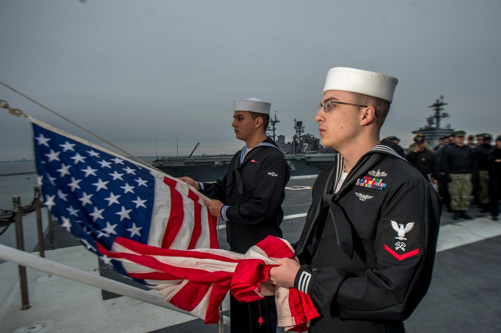 181201-N-NG136-0023 NORFOLK (Dec. 1, 2018) Logistics Specialist 3rd Class Logan Davidson, right, from Monaca Pennsylvania, and Aviation Boatswain’s Mate (Handling) Airman Recruit Gabriel Gonzalez, from Los Angeles, conduct morning colors on the flight deck aboard the aircraft carrier USS George H.W. Bush (CVN 77). The flag was flown at half-mast to honor the 41st president, George H.W. Bush, the ship’s namesake, who passed away Nov 30, 2018. The ship is in port in Norfolk, Virginia, conducting routine training exercises to maintain carrier readiness. (U.S. Navy photo by Mass Communication Specialist 3rd Class Zachary P. Wickline/Released)