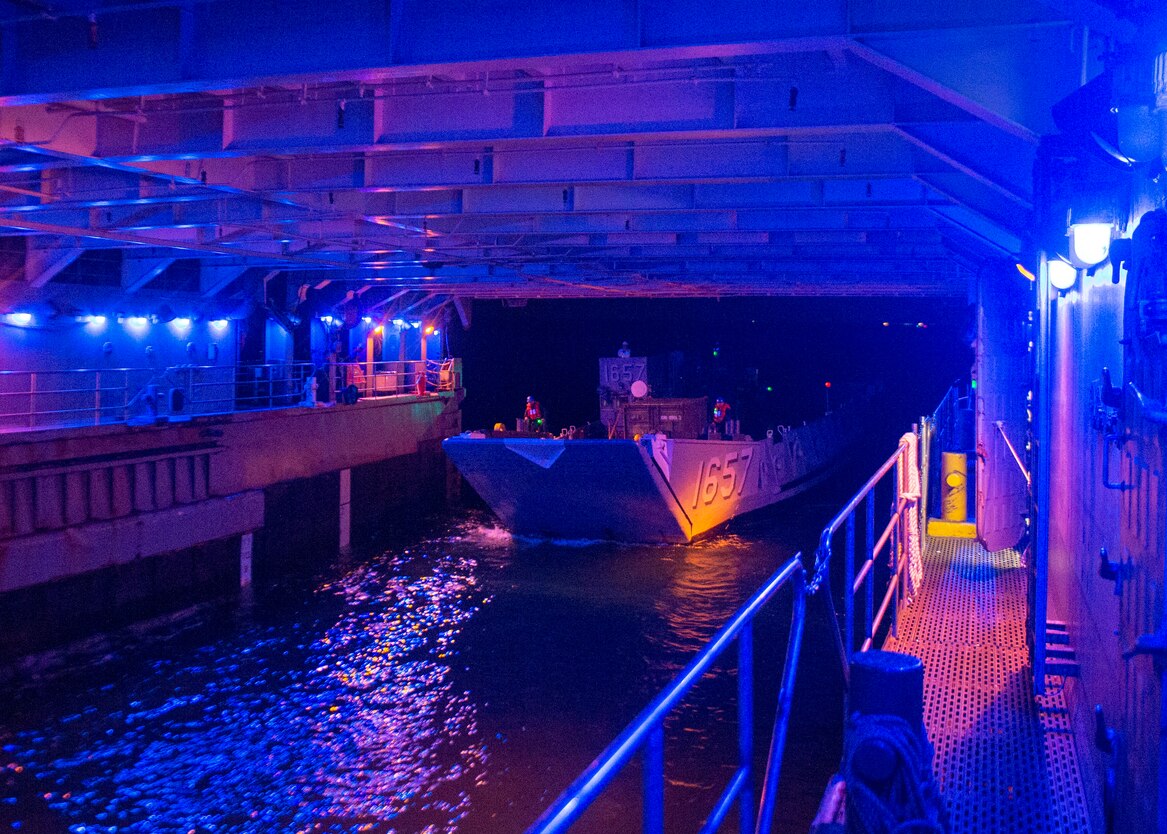 181217-N-AT530-0292 NORFOLK (Dec. 17, 2018) A landing craft utility (LCU) enters the well deck of the Whidbey Island-class amphibious dock landing ship USS Fort McHenry (LSD 43). Fort McHenry is making a scheduled deployment as part of the Kearsarge Amphibious Readiness Group in support of maritime security operations, crisis response and theater security cooperation, while also providing a forward naval presence. (U.S. Navy photo by Mass Communication Specialist 3rd Class Chris Roys/Released)