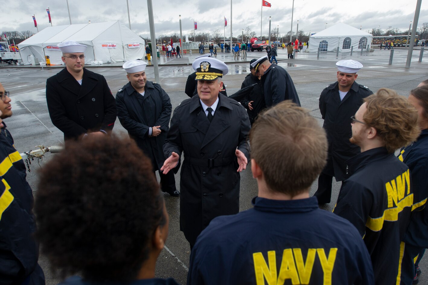 20181231-N-FO865-024 MILLINGTON (Dec 31, 2018) Rear Adm. Andrew Mueller, deputy commander of Navy Recruiting Command (NRC), inspires future sailors at Liberty Bowl Memorial Stadium. Sailors and Marines take the oath of enlistment at the 2018 AutoZone Liberty Bowl, an American college football game in Memphis, Tennessee. (U. S. Navy photo by Mass Communication Specialist 2nd Class Brandon Woods/Released)