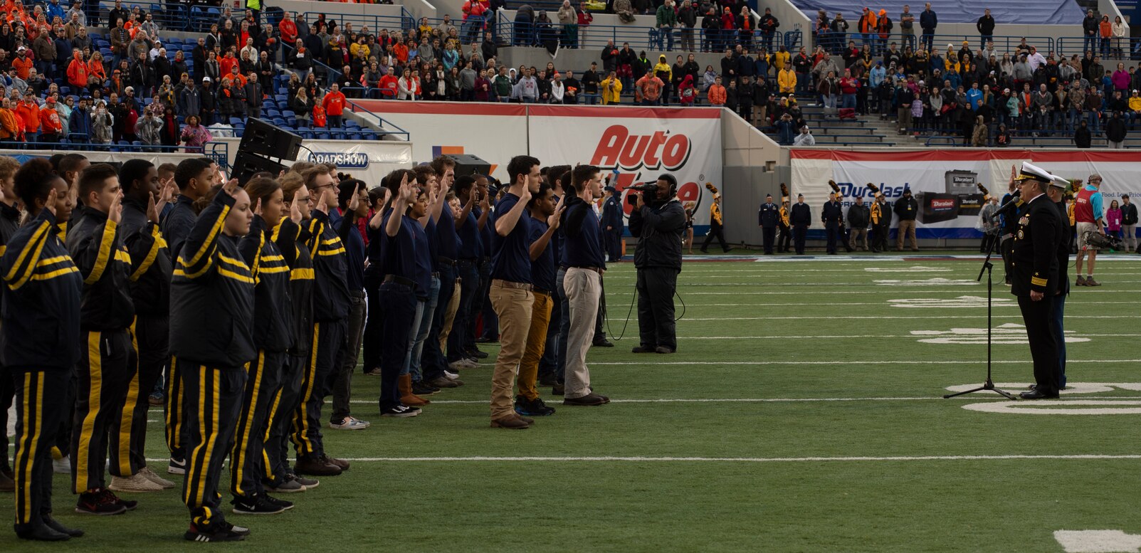 181231-N-FO865-039 MILLINGTON (Dec 31, 2018) Rear Adm. Andrew Mueller, deputy commander of Navy Recruiting Command (NRC), leads Sailors and Marines to take the oath of enlistment at the 2018 AutoZone Liberty Bowl, an American college football game in Memphis, Tennessee. (U. S. Navy photo by Mass Communication Specialist 2nd Class Brandon Woods/Released)