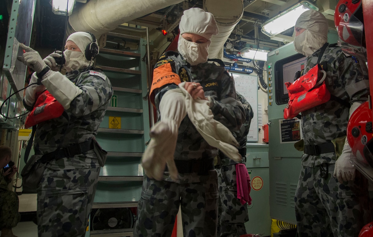 170201-N-MM501-0271 ARABIAN GULF (Feb. 1, 2017) Sailors assigned to the Royal Australian Navy Anzac-class frigate HMAS Arunta (FFH 151) don protective gear while taking part in a damage control drill during Exercise Unified Trident in the Arabian Gulf. Unified Trident is a multilateral exercise with the Royal Navy, Royal Australian Navy and French Marine Nationale to enhance mutual capabilities, improve tactical proficiency and strengthen partnerships in ensuring the free flow of commerce and freedom of navigation within U.S. 5th Fleet area of operations. (U.S. Navy photo by Mass Communication Specialist 2nd Class Shannon Burns/Released)