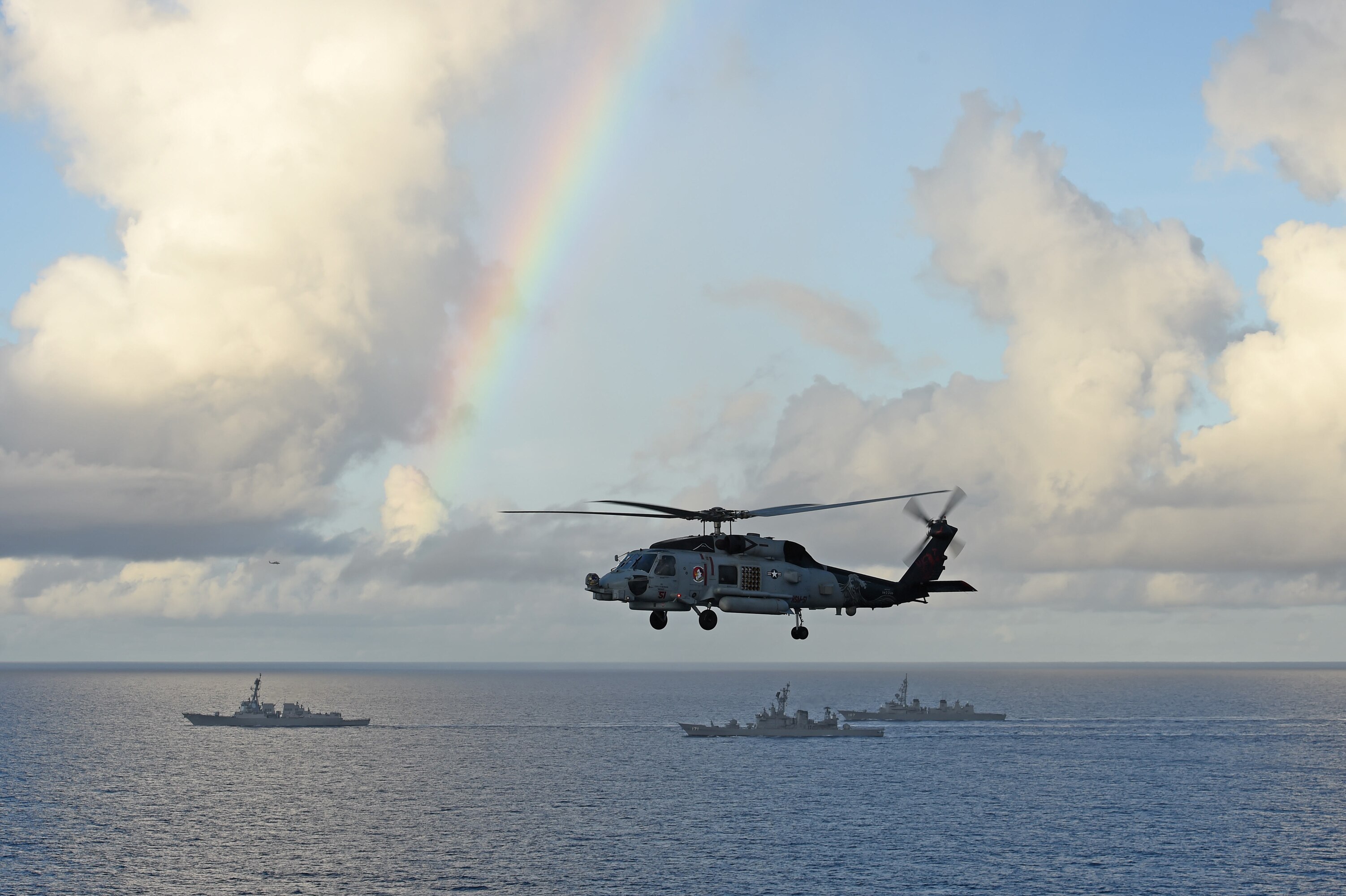 170310-N-GP548-247 PHILIPPINE SEA (March 10, 2017) An MH-60R Sea Hawk helicopter assigned to the “Warlords” of Helicopter Maritime Strike Squadron (HSM) 51 flies past U.S. Navy and Japan Maritime Self-Defense Force ships during MultiSail 17. The bilateral training exercise is designed to improve interoperability between the U.S. and Japanese forces. (U.S. Navy photo by Mass Communication Specialist 1st Class Elijah G. Leinaar/Released)