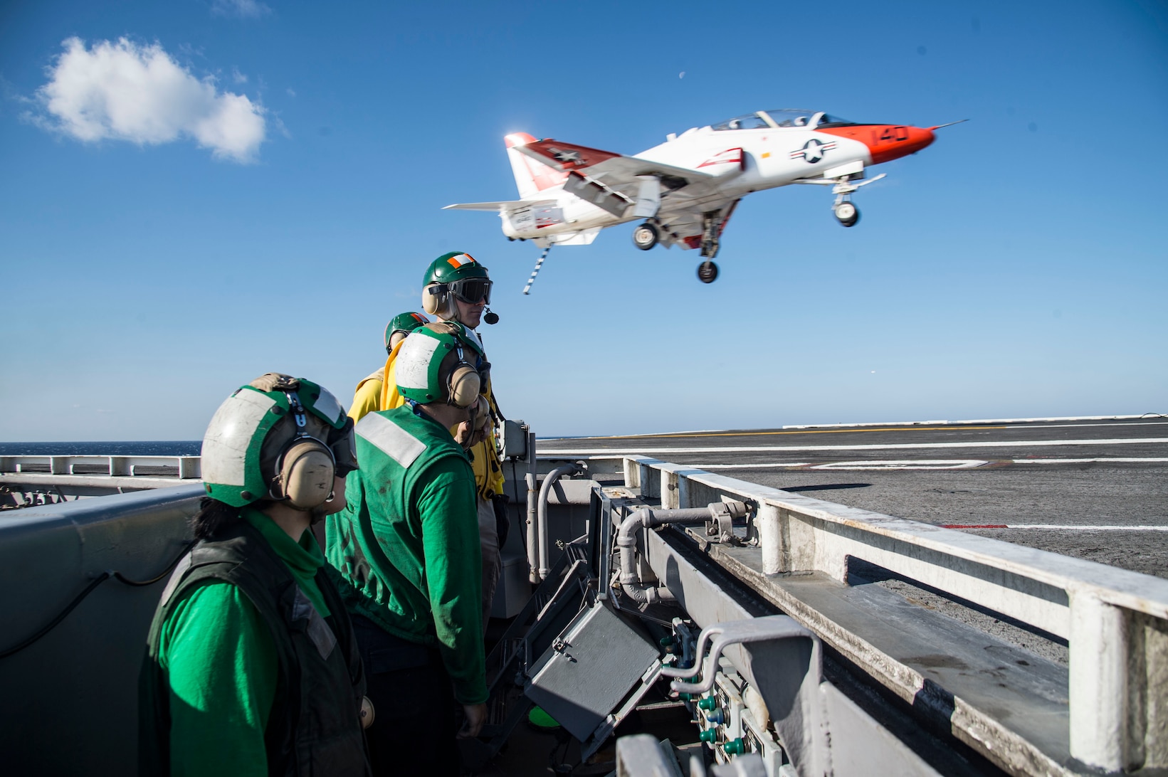 170319-N-OS569-042 ATLANTIC OCEAN (March 19, 2017) Sailors watch as a T-45C Goshawk training aircraft assigned to Carrier Training Wing (CTW) 1 approaches the flight deck of the aircraft carrier USS Dwight D. Eisenhower (CVN 69). The ship is conducting aircraft carrier qualifications during the sustainment phase of the Optimized Fleet Response Plan. (U.S. Navy photo by Mass Communication Specialist Seaman Zach Sleeper/Released)