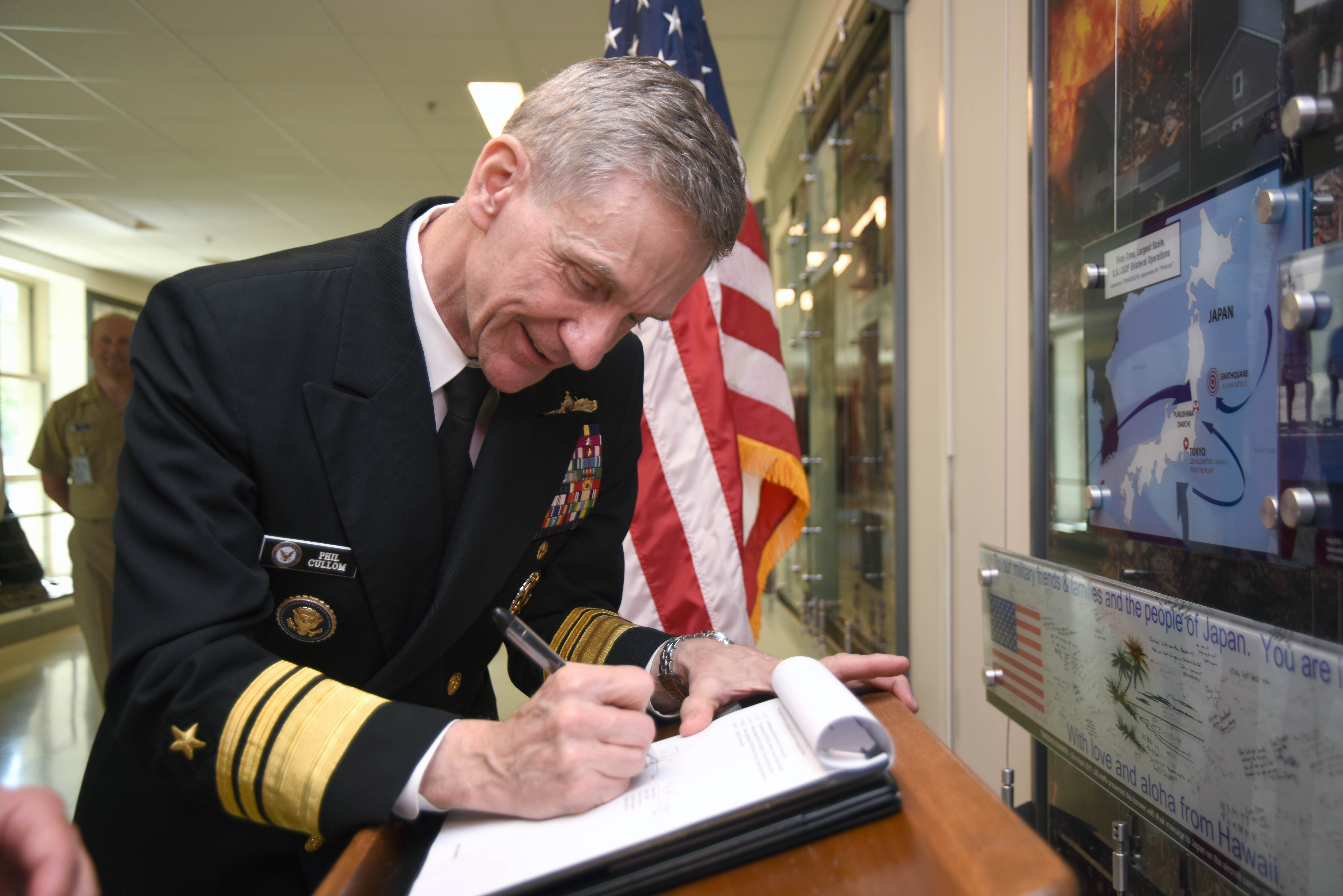 170418-N-SQ432-030 JAPAN (April 18, 2017) Vice Adm. Phil Cullom, deputy chief of naval operations for fleet readiness, signs the Japan Maritime Self-Defense Force-U.S. Navy Logistics Interoperability and Integration Framework Terms of Reference (ToR) after meeting with Rear Adm. Takehisa Nakao, director general of logistics department, Maritime Staff Office, Japan Maritime Self Defense Force. The ToR establishes a strategic oversight and governance construct to support refinement initiatives to achieve logistics interoperability and integration goals between the U.S. Navy and the JMSDF. (U.S. Navy photo by Mass Communication Specialist Second Class Jonathan L. Correa/Released)