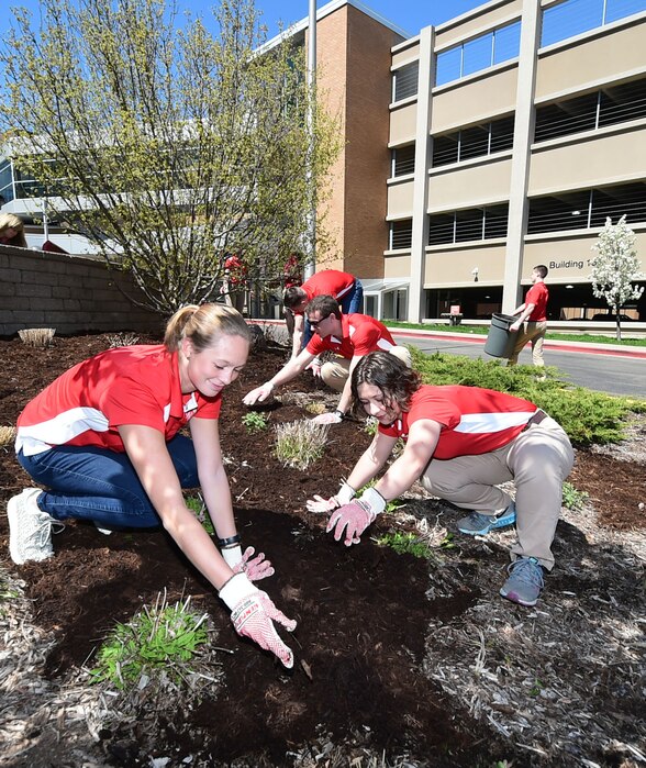 170422-N-IK959-667 MADISON, Wis., (April 22, 2017) University of Wisconsin-Madison Navy ROTC Midshipman 4th Class Anabel Roza, 19, from Seattle, and Midshipman 3rd Class Gretchen Quade, 19, from Bruce, Wisc., spread out mulch on the grounds of the William S. Middleton Veterans Hospital. More than 60 University of Wisconsin-Madison Navy ROTC midshipmen visited with staff, inpatient and outpatient veterans and helped with an Earth Day cleanup of the hospital grounds. ( U.S. Navy photo by Scott A. Thornbloom/Released)