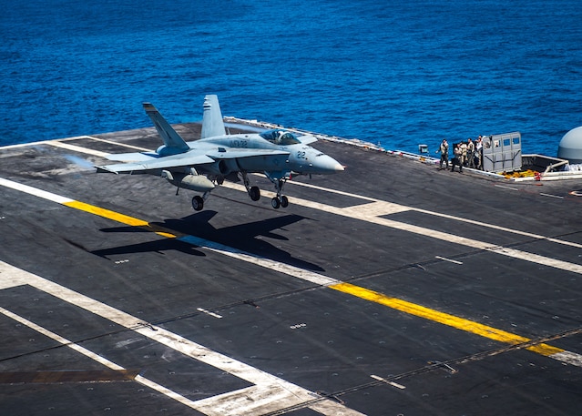 170502-N-AZ808-171 PACIFIC OCEAN (May 2, 2017) A F/A-18C Hornet assigned to the "Checkerboards" of Marine Strike Fighter Attack Squadron (VMFA) 312 lands on the flight deck of the aircraft carrier USS Theodore Roosevelt (CVN 71). The ship is underway conducting a group sail training unit exercise with it's carrier strike group. (U.S. Navy Photo by Mass Communication Specialist Seaman Nicholas R. Burgains/Released)