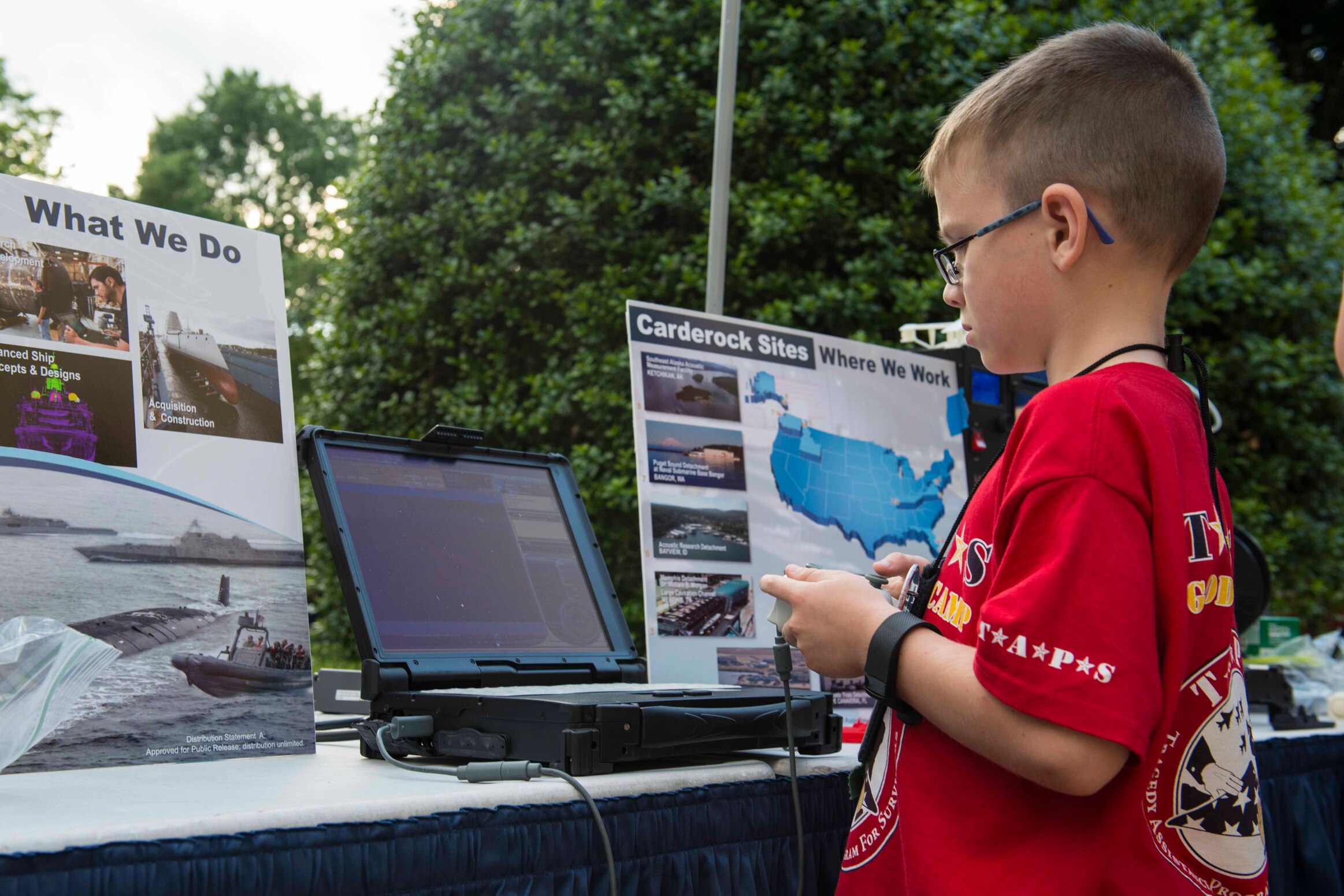 170526-N-VC236-223 WASHINGTON (May 26, 2017) A member of the Tragedy Assistance Program for Survivors (TAPS) controls a robot at the Naval Surface Warfare Center, Carderock Division, display booth during a visit to the Pentagon. Surviving parents, spouses, children, siblings, and others grieving the death of a service member are gathering for the 23rd Annual TAPS National Military Survivor Seminar and Good Grief Camp for Young Survivors. (U.S. Navy photo by Mass Communication Specialist 2nd Class Jackie Hart/Released)