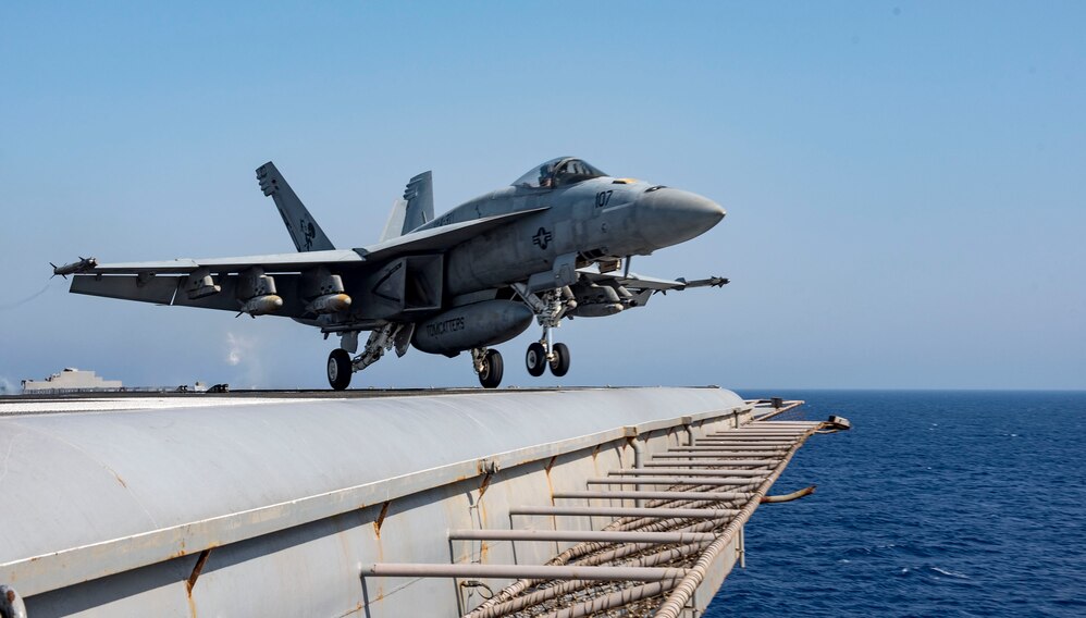 170712-N-FE442-102 MEDITERRANEAN SEA (July 12, 2017) An F/A-18E Super Hornet attached to the "Tomcatters" of Strike Fighter Squadron (VFA) 31 launches from the aircraft carrier USS George H.W. Bush (CVN 77). The ship and its carrier strike group are conducting naval operations in the U.S. 6th Fleet area of operations in support of U.S. national security interests in Europe and Africa. (U.S. Navy photo by Mass Communication Specialist 3rd Class Matt Matlage/Released)