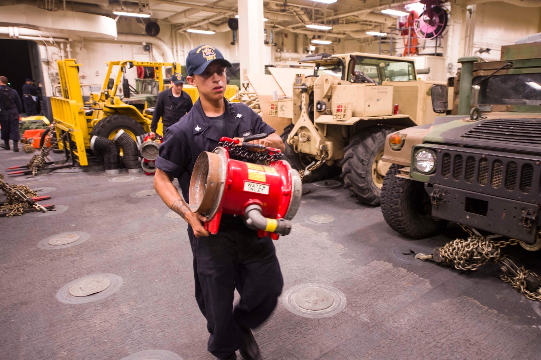 170821-N-UK248-103 SINGAPORE (Aug. 21, 2017) Boatswain’s Mate 3rd Class Elliot Lee, assigned to the engineering department aboard the amphibious assault ship USS America (LHA 6), transports a RAMFAN 2000 from the ship’s lower vehicle stowage area to the Arleigh Burke-class guided-missile destroyer USS John S. McCain (DDG 56) following a collision in the Straits of Malacca. America, part of the America Amphibious Ready Group, with the embarked 15th Marine Expeditionary Unit (15th MEU), is operating in the Indo-Asia Pacific region to strengthen partnerships and serve as a ready-response force for any type of contingency. (U.S. Navy photo by Mass Communication Specialist 2nd Class Kristina Young/Released)